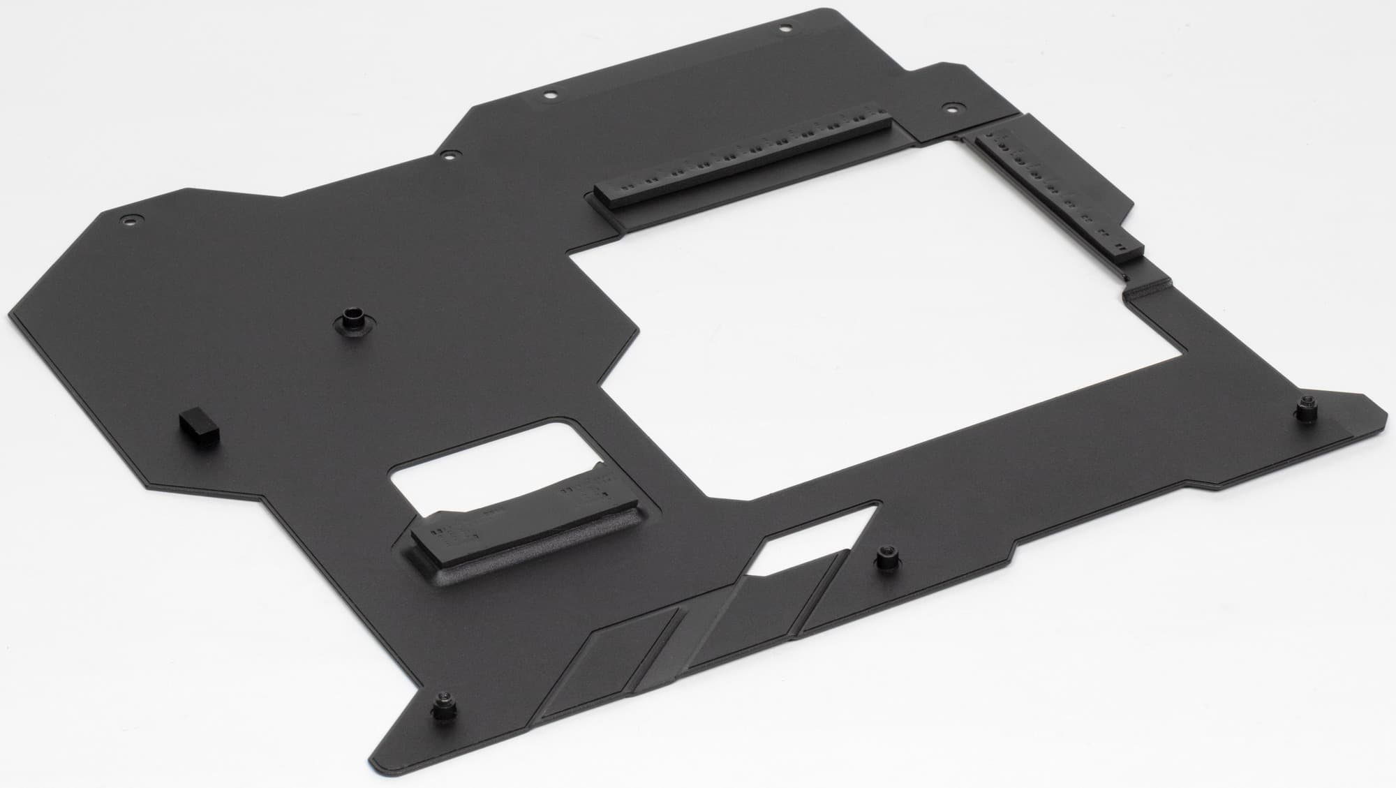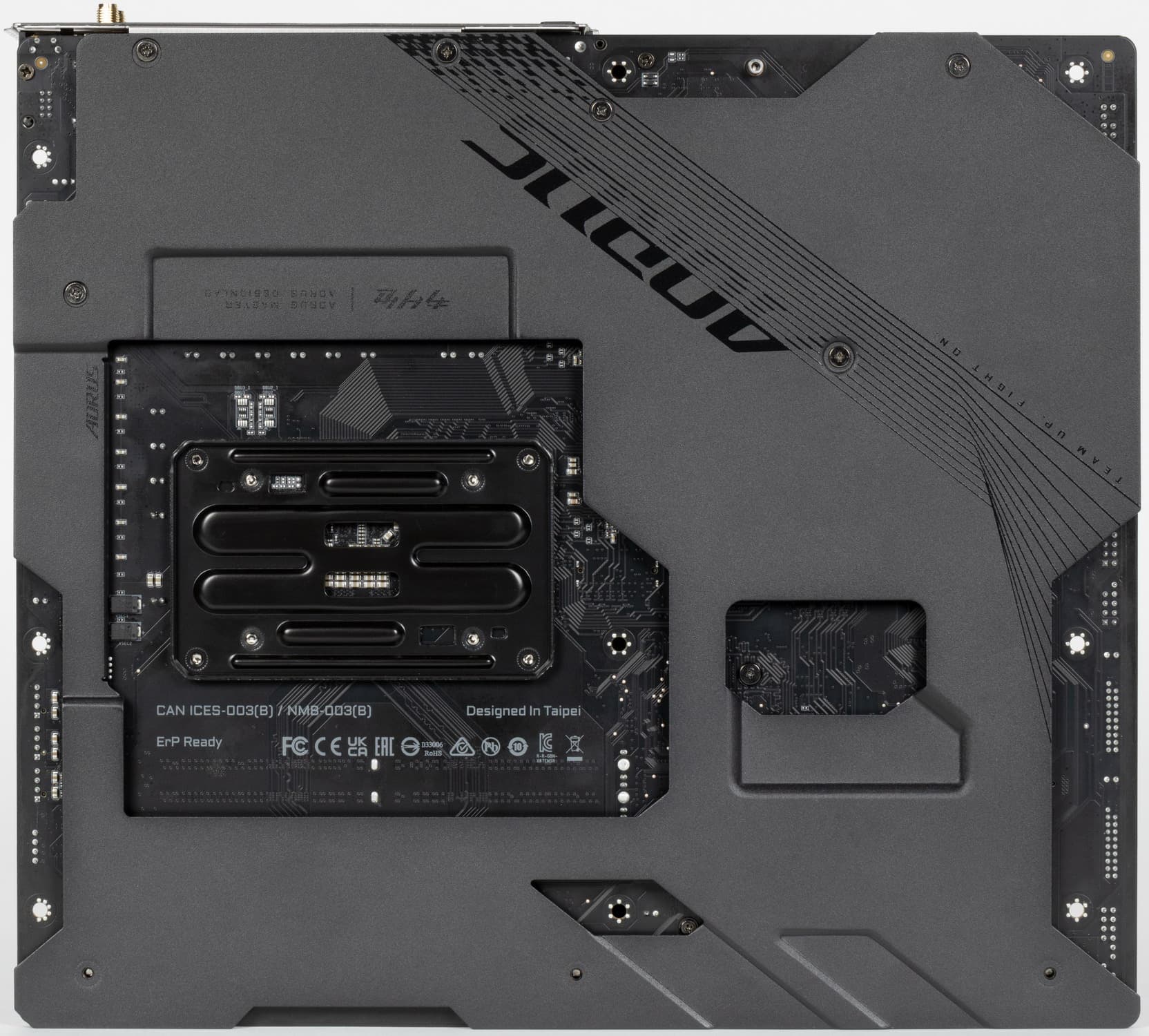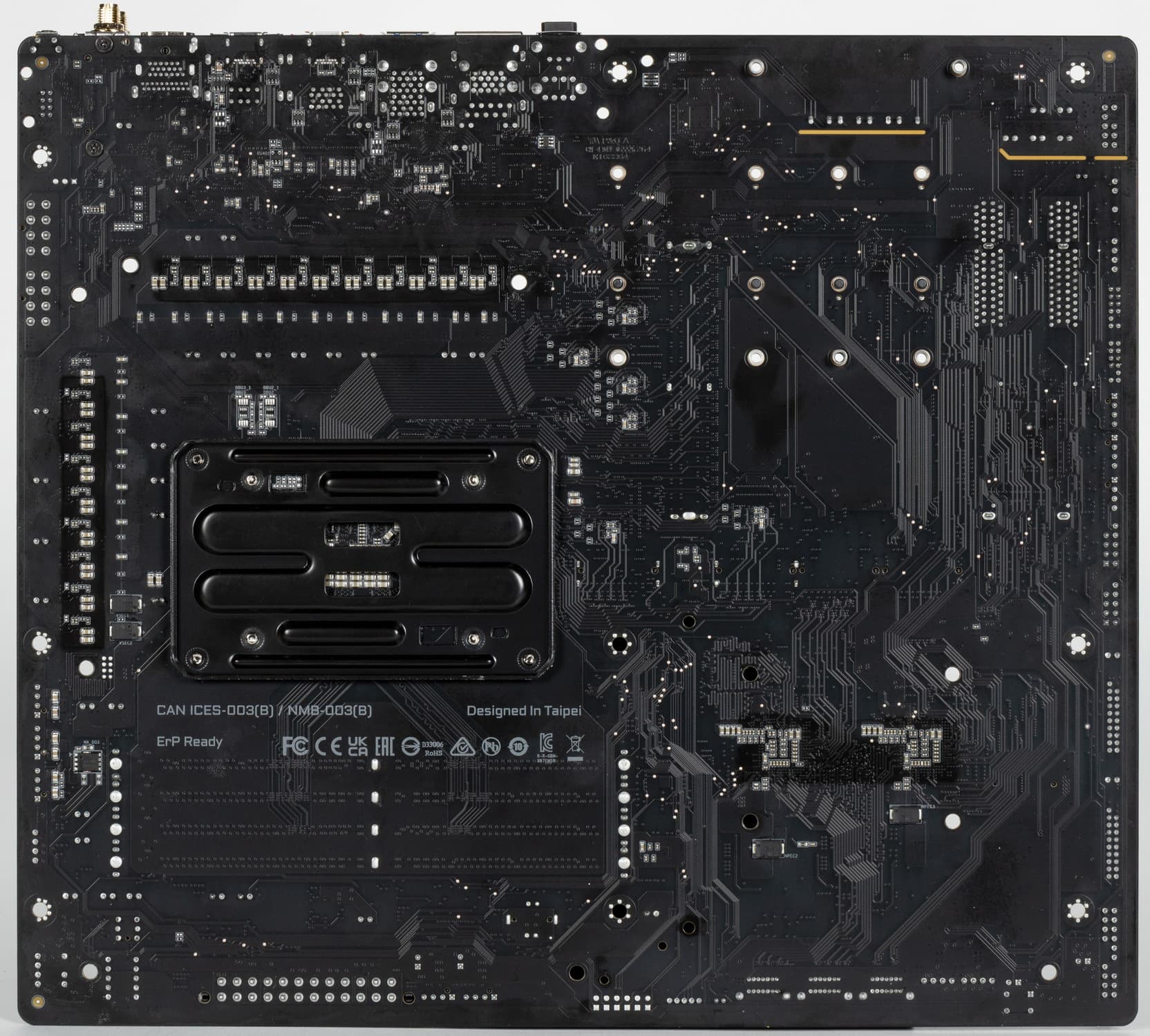 На оборотной стороне почти ничего нет. Текстолит обработан хорошо: во всех точках пайки не только острые концы срезаны, но и все неплохо отшлифовано. На задней стороне установлена пластина из алюминия с наноуглеродным покрытием. Она пластина помогает отводить тепло от задней стороны PCB через термоинтерфейс и обеспечивает жесткость материнской платы.