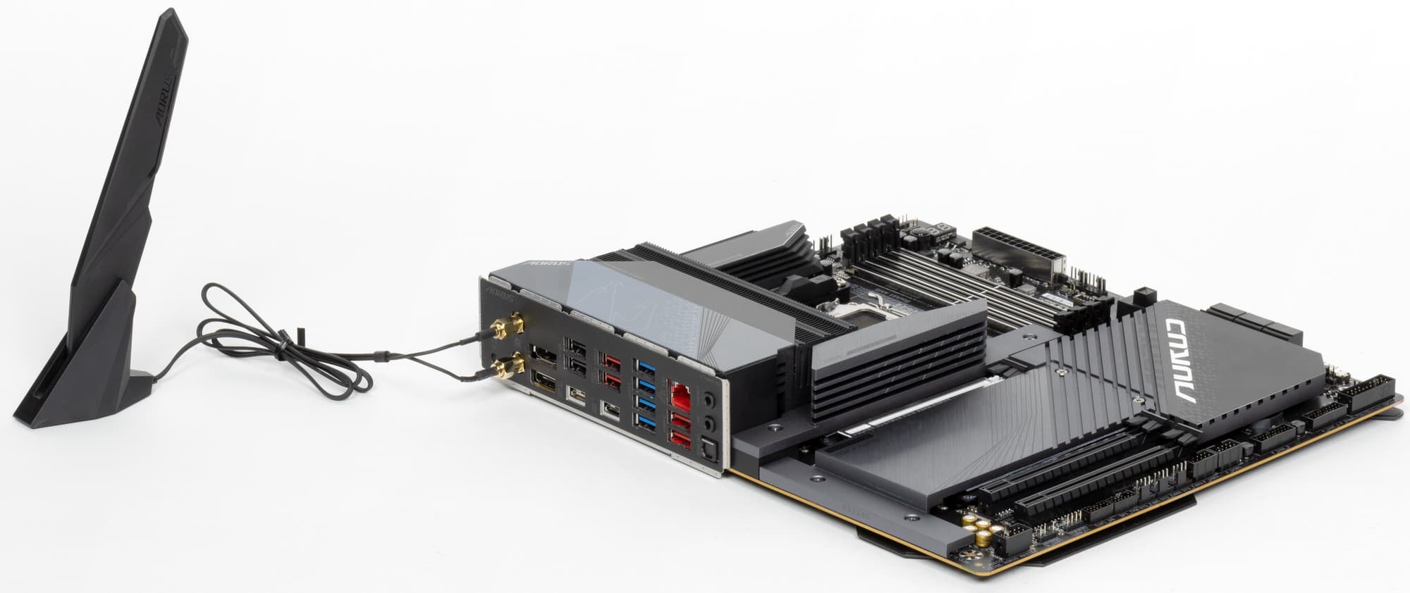 Комплект поставки для одного из топовых продуктов в целом неплох: кроме традиционных элементов типа руководства пользователя и кабелей SATA, имеются антенна встроенного Wi-Fi/BT-модуля, удлинитель и адаптер для подключения подсветок, фирменный G-connector для передней панели), два термодатчика, датчик шума, бонусные наклейки и стяжки.
