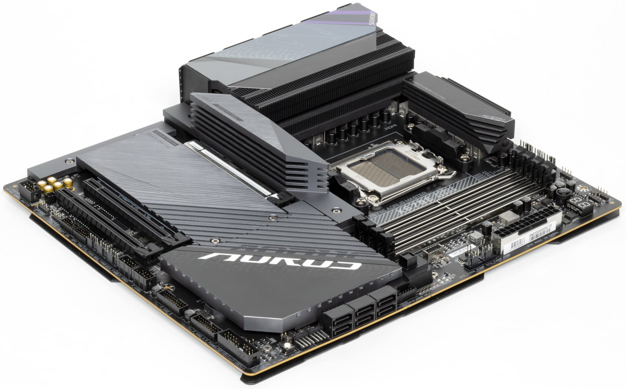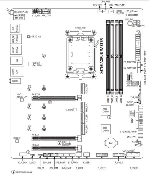 Форм-фактор ATX имеет размеры до 305×244 мм, а E-ATX — до 305×330 мм. Материнская плата Gigabyte X670E Aorus Master имеет размеры 305×270 мм, поэтому выполнена в форм-факторе E-ATX, и на ней имеются 9 монтажных отверстий для установки в корпус. Однако следует иметь в виду, что два из девяти монтажных отверстий перекрыты радиатором для слота M.2 (M2A_CPU).