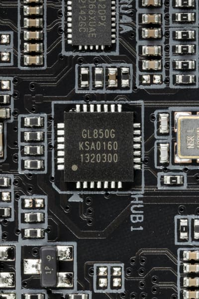 - 6 портов USB 2.0/1.1: 4 реализованы через X670E и представлены двумя внутренними разъемами (каждый на 2 порта); еще 2 реализованы через контроллер Genesys Logic GL850G (на него потрачена 1 линия USB 2.0 от CPU) и представлены 2 портами Type-A на задней панели (черные).
