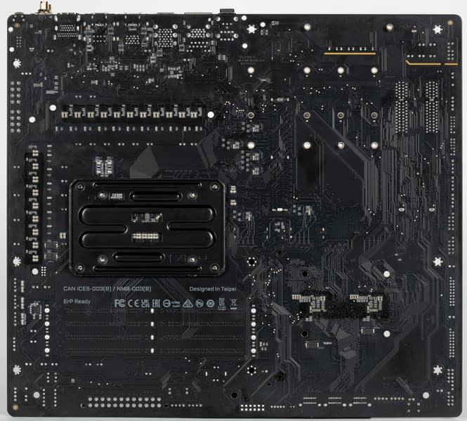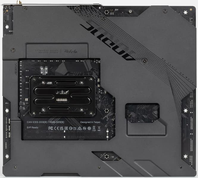 Материнская плата имеет бэкплейт с оборотной стороны, который не только защищает PCB от повреждений, но является вспомогательным охладителем VRM.