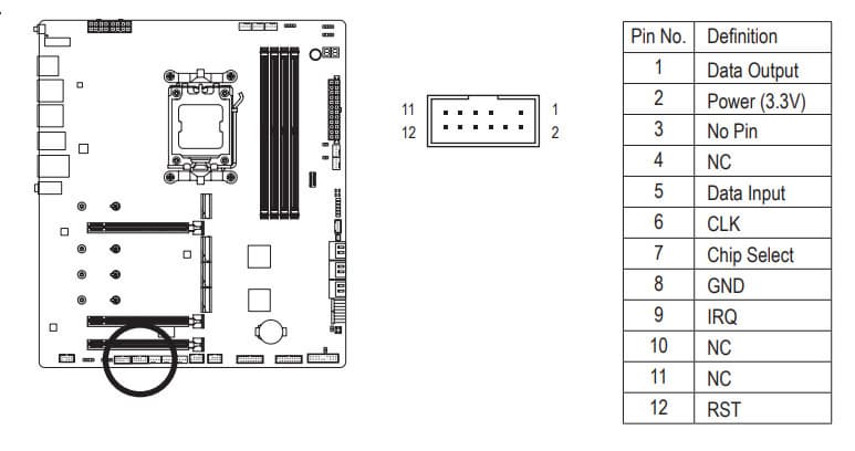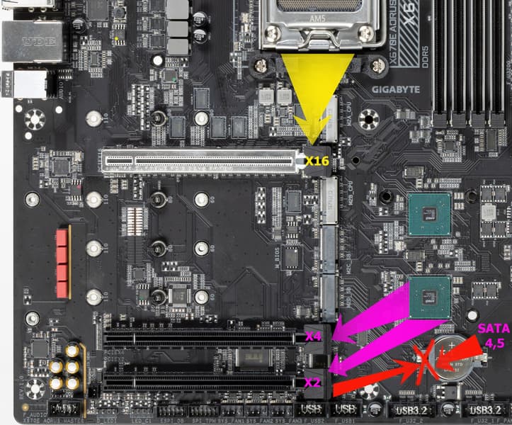 Выше приведена полная схема распределения ресурсов по слотам PCIe. Всего на плате есть 3 слота PCIe: один PCIe x16 PCIe 5.0, получающий данные от процессора, и два «длинных» слота, получающие данные от X670E, но работающие по схеме x4 и x2. Последний слот PCIe x16_3 делит ресурсы с двумя портами SATA 4 и 5.