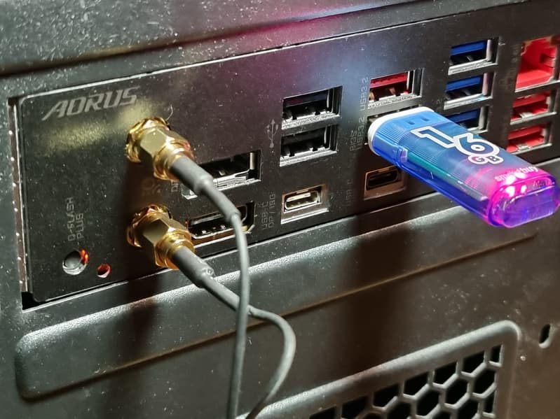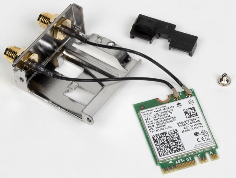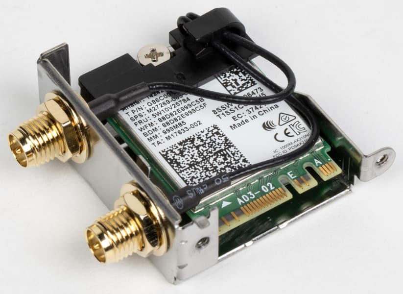 Имеется и комплексный беспроводной адаптер на контроллере Intel AX-210NGW, через который реализованы Wi-Fi 6E (802.11a/b/g/n/ac/ax) и Bluetooth 5.2. Он установлен в слот M.2 (E-key), и его разъемы для привинчивания выносных антенн выведены на заднюю панель.