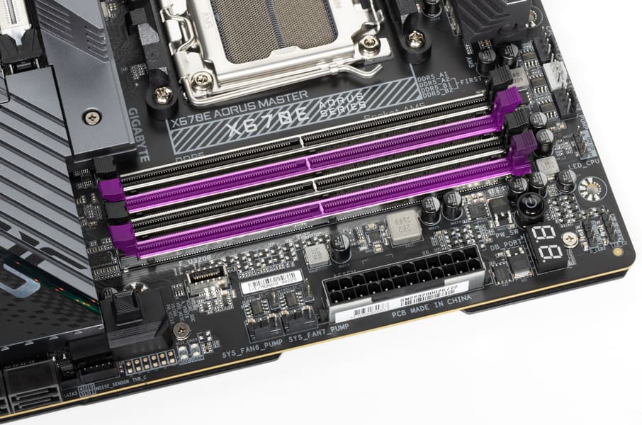 Для установки модулей памяти на плате имеется четыре DIMM-слота (для работы памяти в Dual Channel в случае использования всего 2 модулей их следует устанавливать в А2 и B2). Плата поддерживает небуферизованную память DDR5, а максимальный объем памяти составляет 128 ГБ. Поддерживаются профили XMP и Expo.