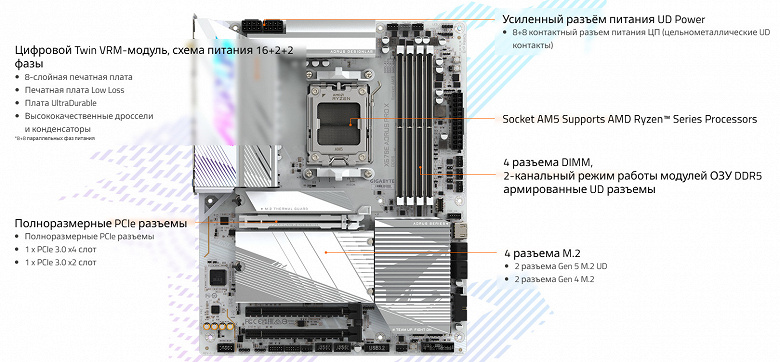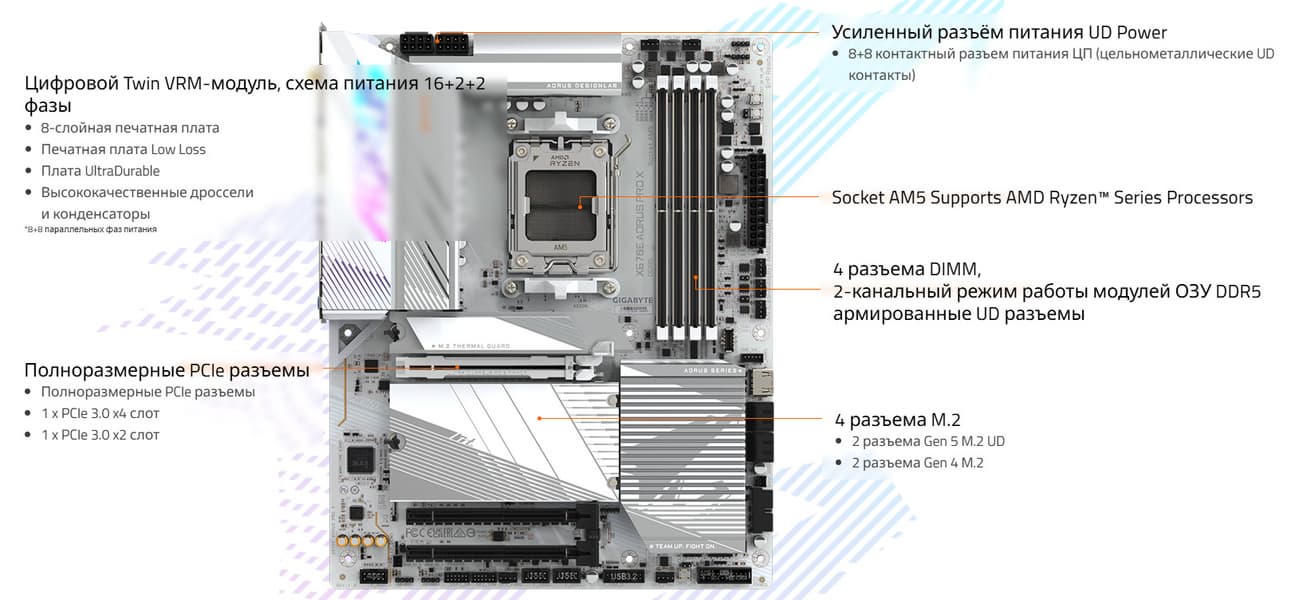 | Поддерживаемые процессоры | AMD Ryzen 7xxx/8xxx/9xxx под AM5 |