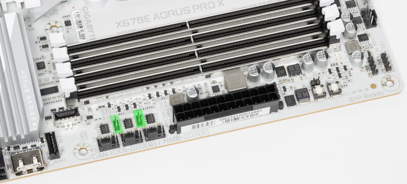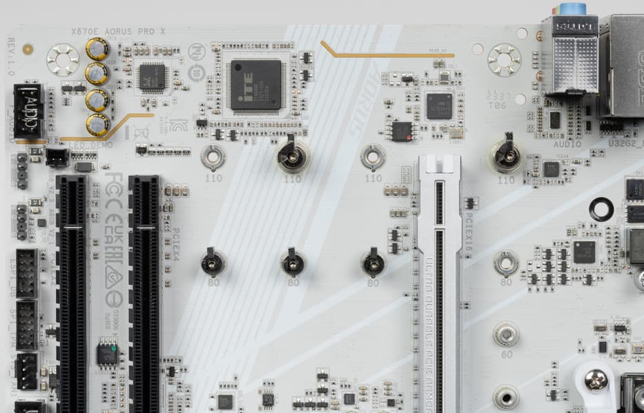 Всего на плате есть 3 слота: слот PCIe x16_1 (для видеокарт или других устройств, режим х16/x8+x4+x4), слот PCIe x16_2, работающий в режиме х4 и слот PCIe x16_3, работающий в режиме х2. Если про первый PCIe x16_1 я выше уже рассказал (он подключен к CPU), то PCIe x16_2/3 подключены к X670E, но разными версиями: PCIe x16_2 – PCIe 4.0, PCIe x16_3 – PCIe 3.0.