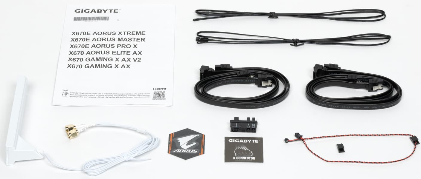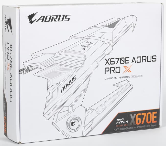 Gigabyte X670E Aorus Pro X поставляется в традиционной коробке фирменного дизайна серии (но белого цвета, подчеркивающего окрас самой материнки). Комплект размещен под платой в отдельном отсеке.