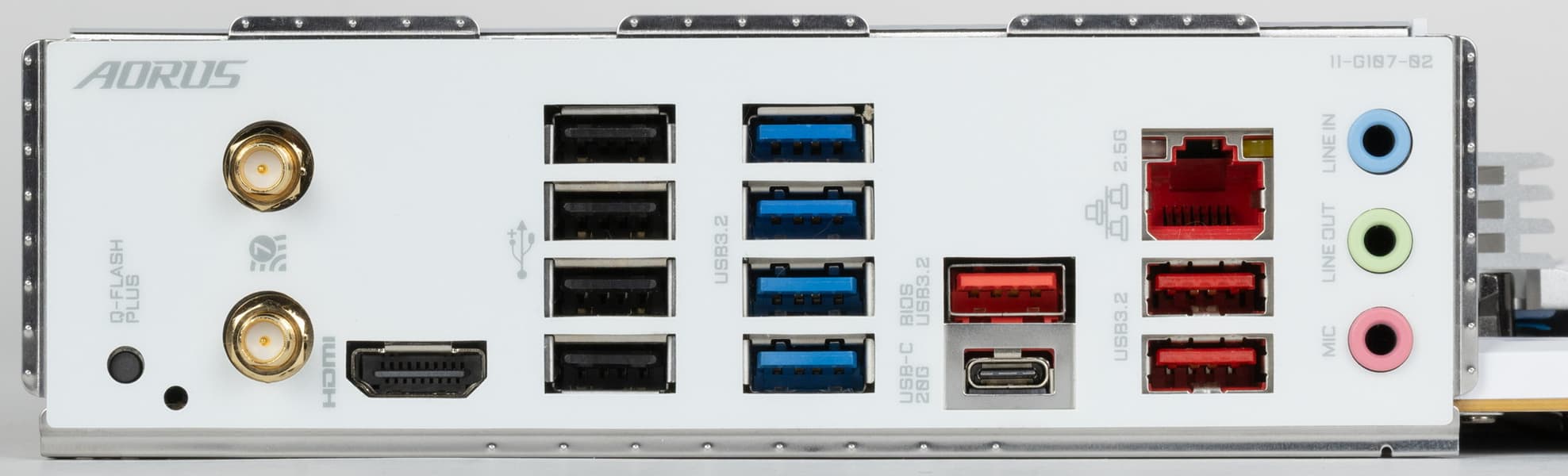 | Разъемы на задней панели | 1 × USB 3.2 Gen2x2 (Type-C) 3 × USB 3.2 Gen2 (Type-A) 4 × USB 3.2 Gen1 (Type-A) 4 × USB 2.0 (Type-A) 1 × RJ-45 4 аудиоразъема типа миниджек 1 × HDMI (выход) 2 антенных разъема кнопка перепрошивки BIOS — Q-Flash Plus |