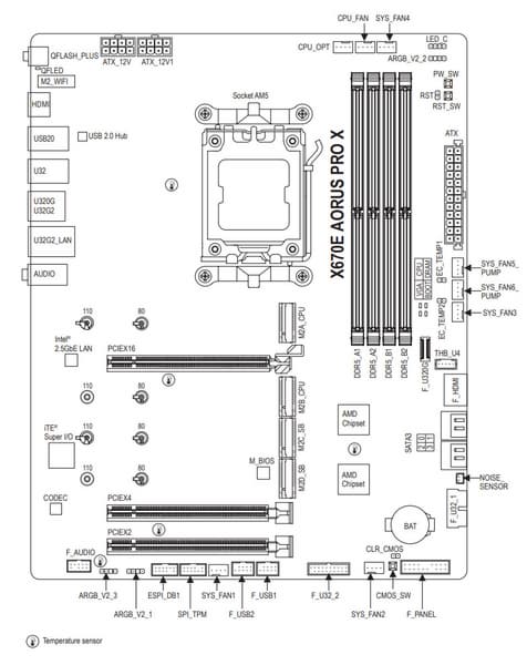 Форм-фактор ATX имеет размеры до 305×244 мм, а E-ATX — до 305×330 мм. Материнская плата Gigabyte X670E Aorus Pro X имеет размеры 305×244 мм, поэтому выполнена в форм-факторе ATX, и на ней имеются 9 монтажных отверстий для установки в корпус. Одно из отверстий частично перекрыто радиатором от M.2 слота.