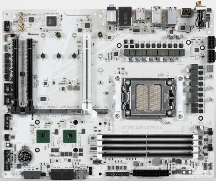 Материнская плата Gigabyte X670E Aorus Pro X относится к игровой серии, основана на практически топовом чипсете AMD X670E (это те же 2 микросхемы Promontory21, что и у X870E) и позиционируется для работы с топовыми процессорами AMD платформы AM5. Это решение для игровых ПК весьма высокого уровня, при этом модель не относится к флагманским, и ее можно найти в продаже по цене в пределах 25-28 тысяч рублей. Повторим, что X670E ничем не отличается от X870E, просто платы с X870E обязательно имеют хаб USB4, который, в общем, не так уж актуален на сегодня.