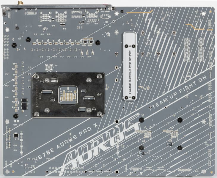 На оборотной стороне расположена металлическая пластина жесткости крепления основного слота PCIe x16 и традиционная некоторая логика. Текстолит обработан хорошо: во всех точках пайки острые концы срезаны,а также отшлифовано. Защитной пластины (бэкплейта) нет. Любопытно отметить, что с оборотной стороны плата покрашена в серый, а не белый цвет, а также видны попытки создания некоего абстрактного рисунка.