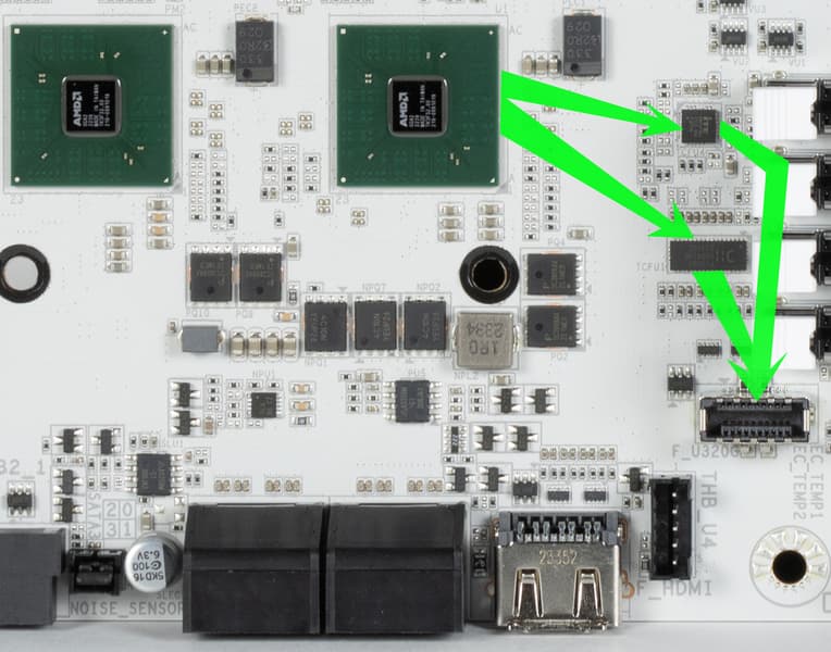 Все быстрые USB 3.2 порты оснащены ре-драйверами.