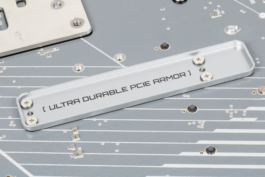 Первый («процессорный») слот PCIe x16 имеет не только жесткую защиту от деформирования в виде пластины с оборотной стороны платы (о чем я выше уже писал), но также еще и металлическое армирование из цинкового сплава, которое увеличивает надежность. Кроме того, такая защита предохраняет слот от электромагнитных помех.