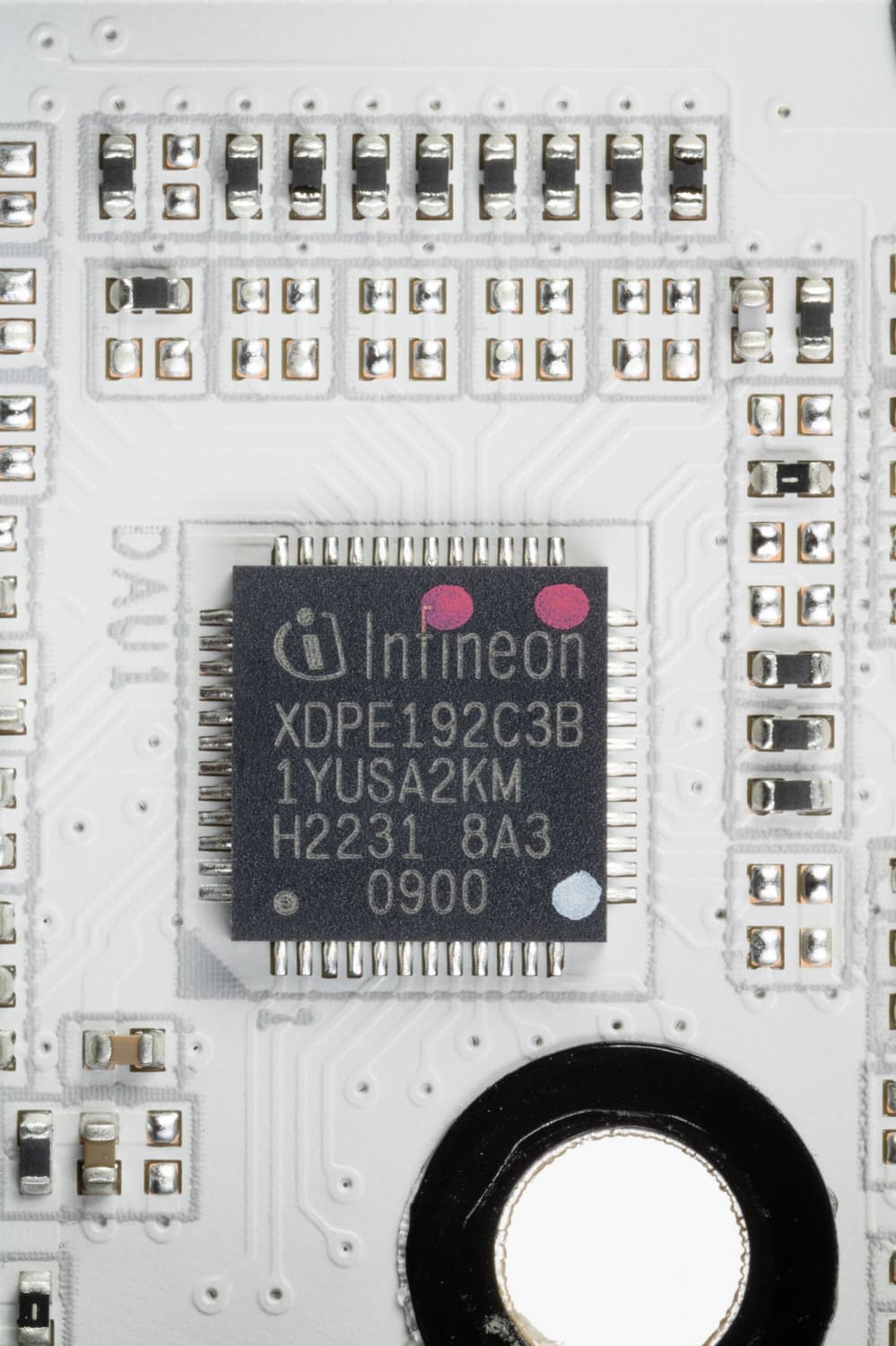 Управляет обоими наборами фаз (16+2) ШИМ-контроллер XDPE192C3B от Infineon, рассчитанный на 12 фаз, поэтому у фаз питания для VCore организовано параллельное управление: 8x2 плюс 2 фазы на встроенную графику: физически 10 фаз питания.