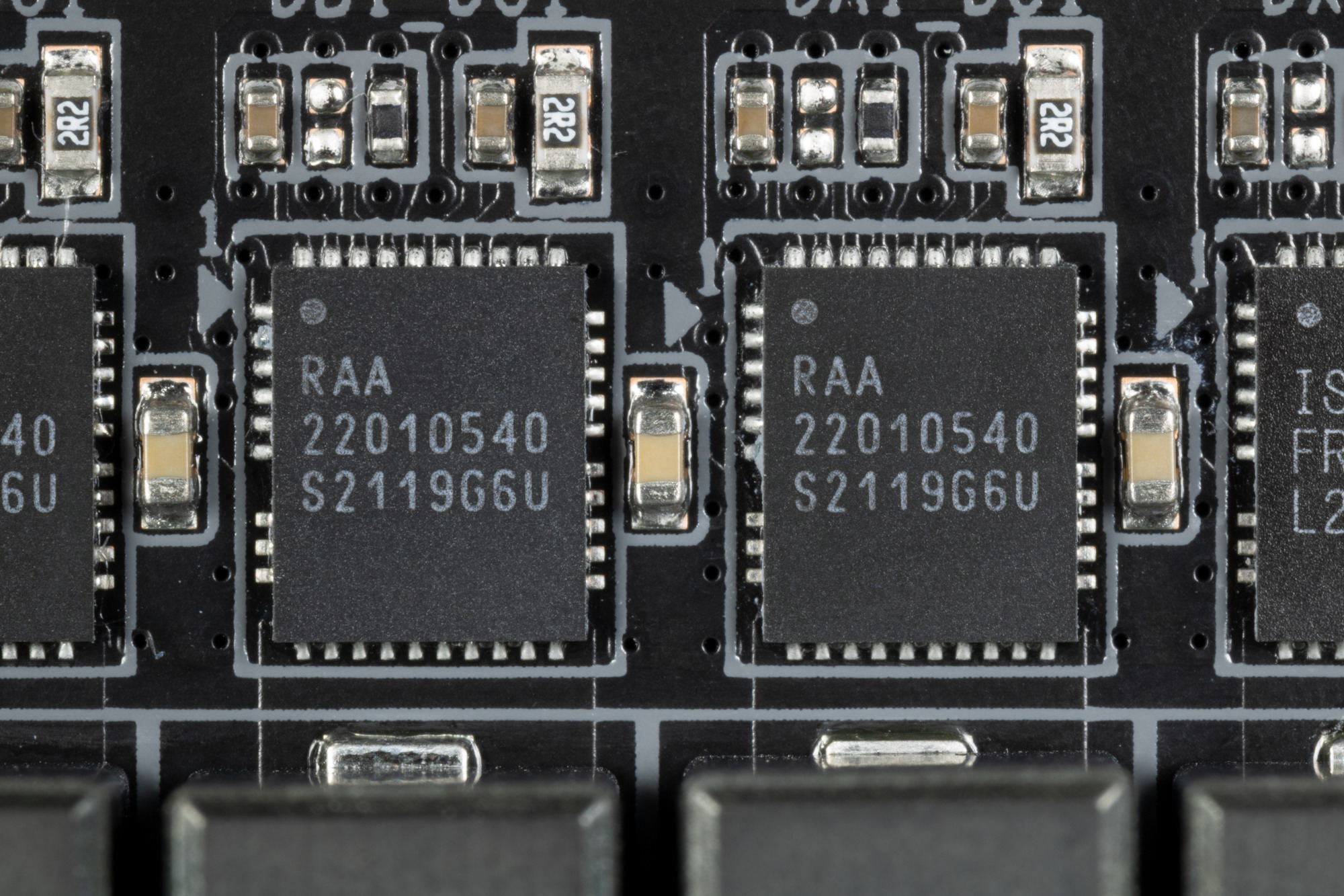 Каждая фаза VCore имеет по транзисторной сборке RAA22010540 от Renesas (до 105А).