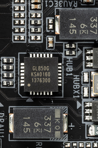 - 8 портов USB 2.0/1.1: 4 реализованы через X670E и представлены двумя внутренними разъемами (каждый на 2 порта); еще 4 реализованы через контроллер Genesys Logic GL850G (на него потрачена 1 линия USB 2.0 от CPU) и представлены 4 портами Type-A на задней панели (черные).