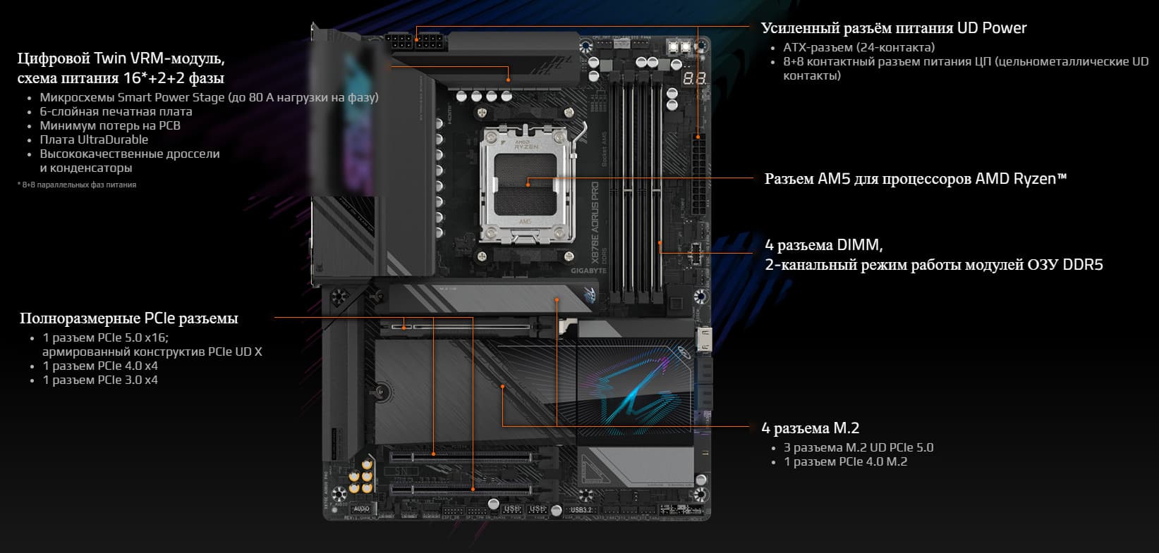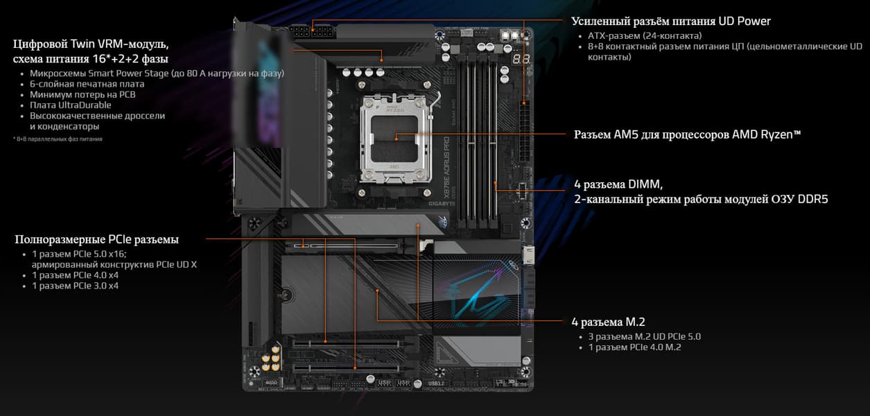 | Поддерживаемые процессоры | AMD Ryzen 7xxx/8xxx/9xxx под AM5 |