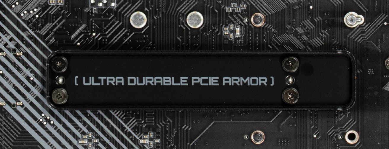 Первый («процессорный») слот PCIe x16 имеет не только жесткую защиту от деформирования в виде пластины с оборотной стороны платы (о чем я выше уже писал), но также еще и металлическое армирование из цинкового сплава, которое увеличивает надежность. Кроме того, такая защита предохраняет слот от электромагнитных помех.