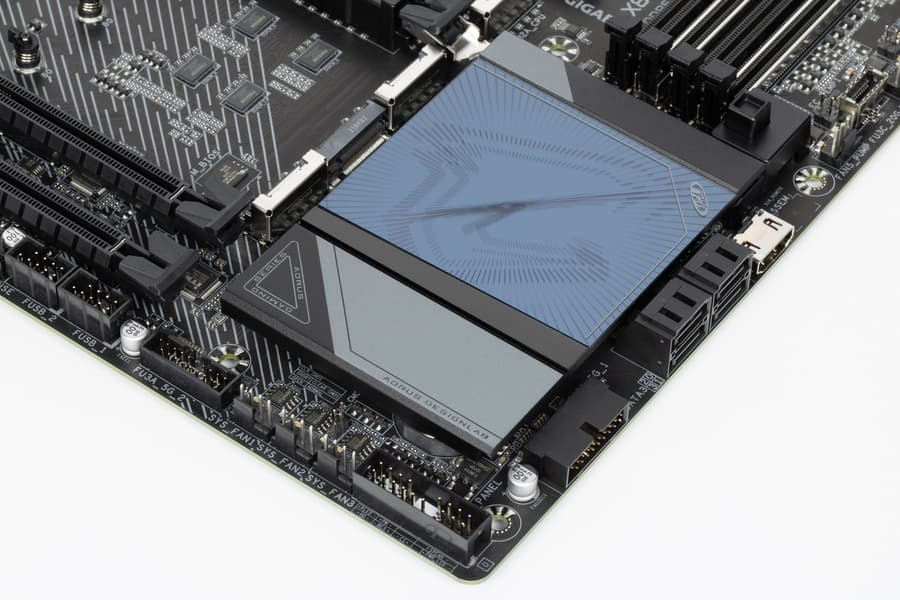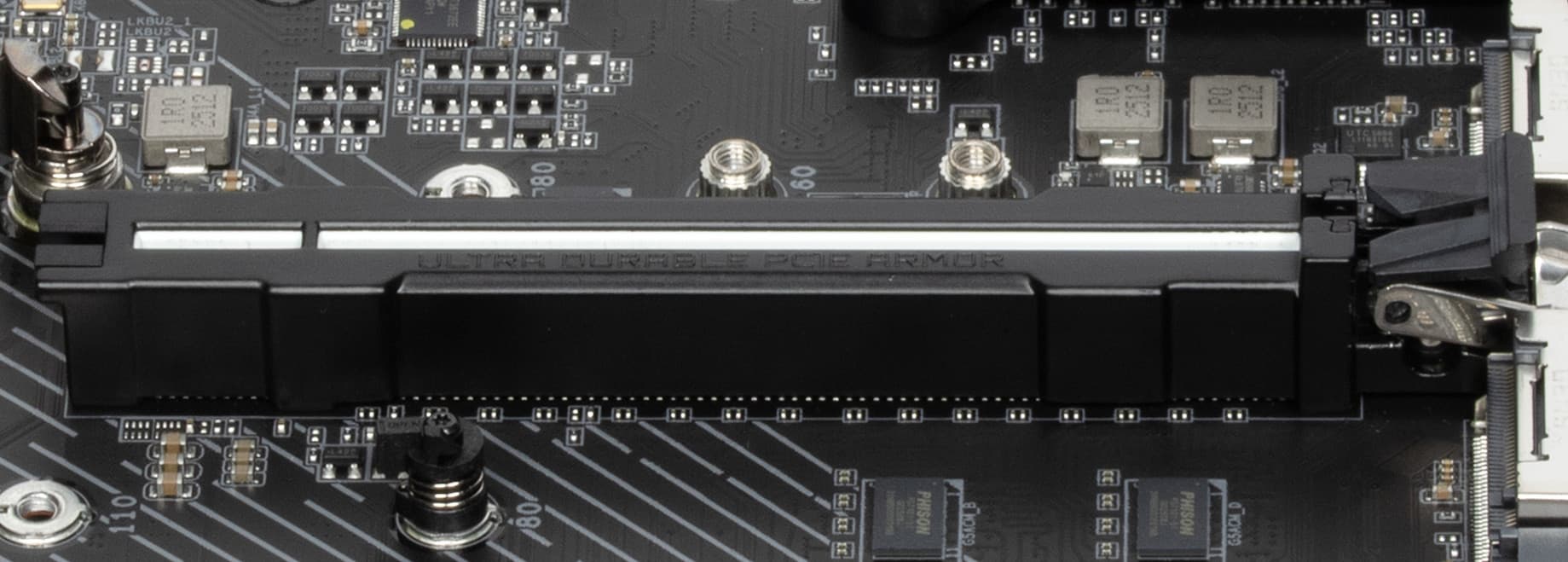 Все M.2 слоты на матплате имеют радиаторы. Слот M2A_CPU обладает отдельным очень толстым радиатором, когда как остальные M.2 слоты имеют общий радиатор. Следует отметить, что слот M2A_CPU кроме охлаждения верхней стороны имеет еще и нижний радиатор.