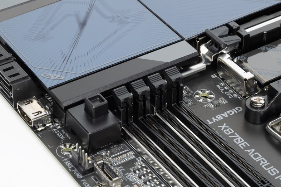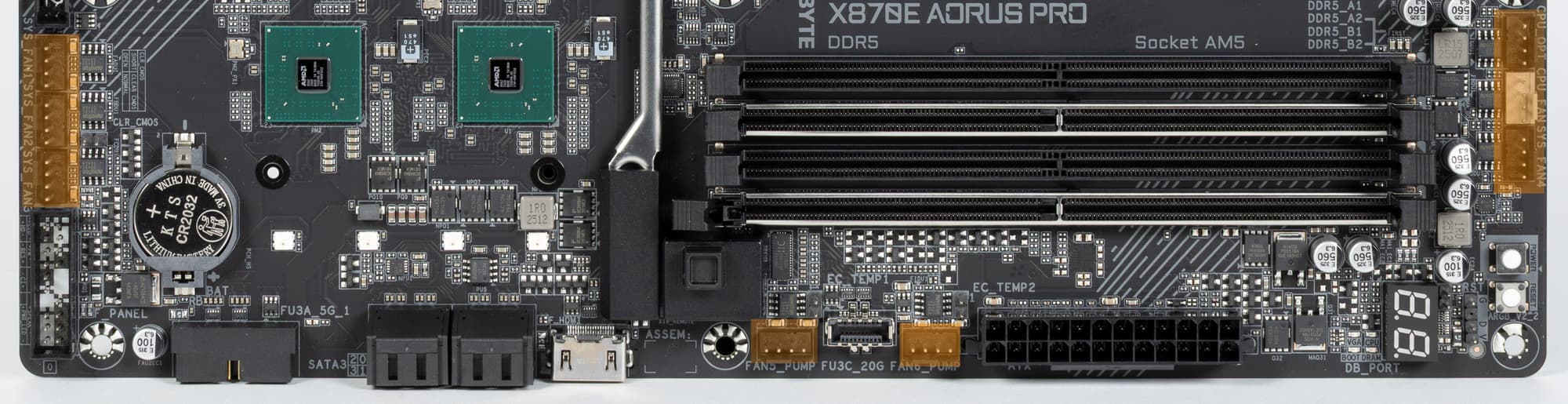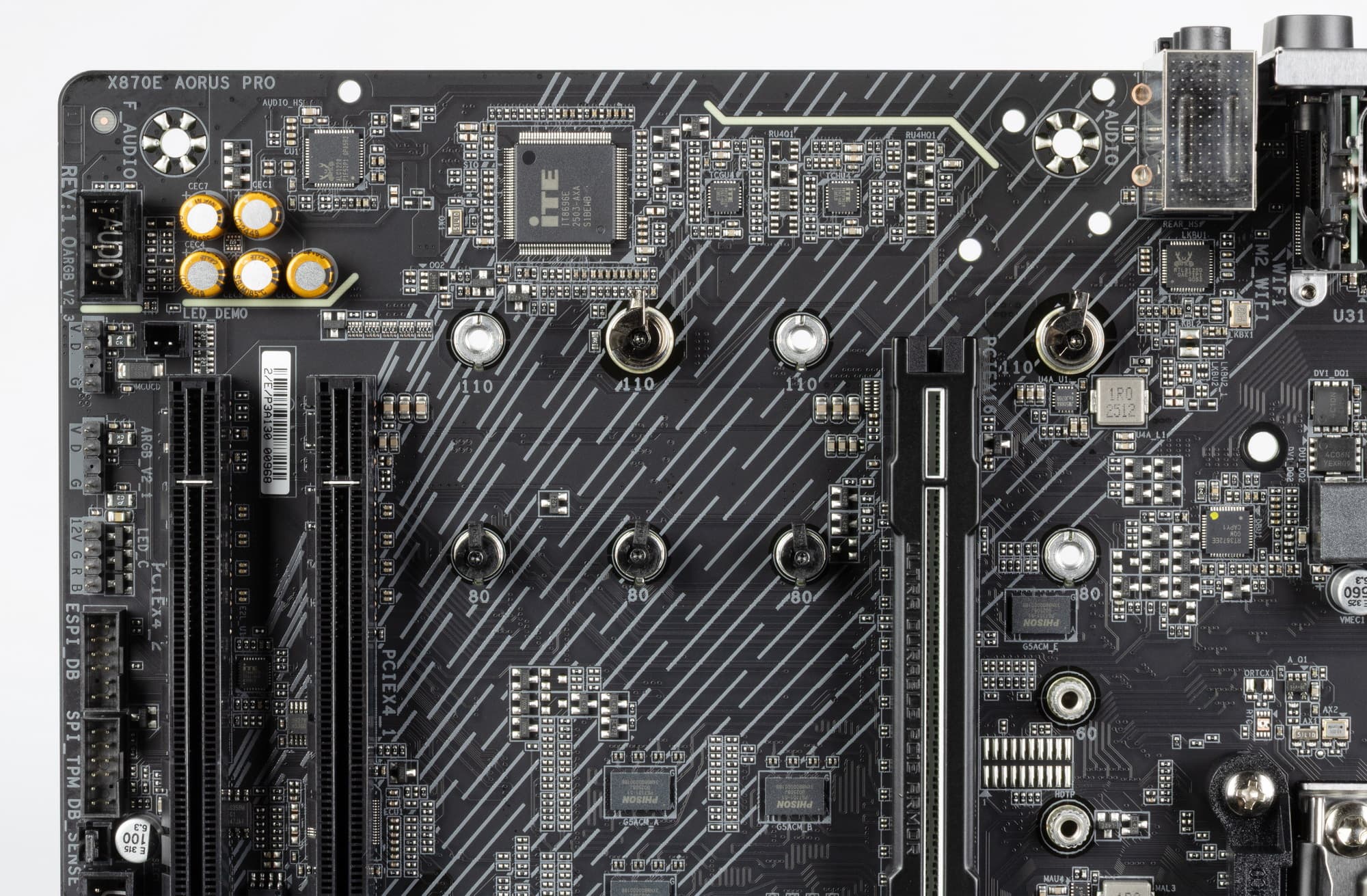 У Gigabyte X870E Aorus Pro имеется 20 портов USB разных видов, включая 2 самых современных USB4 (40 Гбит/с), 11 USB 3.2 Gen1/2, а также USB 3.2 Gen2×2 в виде внутреннего порта Type-C. Плата предлагает 1 слот PCIe х16, который получает от процессора 16 линий PCIe версии 5.0 (и делит их с двумя слотами M.2, подключенными к процессору), также имеется 2 слота формата PCIe x16, соединенных с чипсетом 4 линиями PCIe 4.0/3.0. Всего у платы 4 слота M.2: три из них подключены напрямую к процессору линиями PCIe 5.0, один подключен к чипсету X870E линиями PCIe 4.0. Также в арсенале платы есть 4 порта SATA и 8 разъемов для вентиляторов. Система питания процессора очень мощная, она способна обеспечить работу любых совместимых процессоров с приличным запасом на разгон. Плата имеет грамотную систему охлаждения каждого потенциально греющегося элемента, включая накопители в слотах M.2.