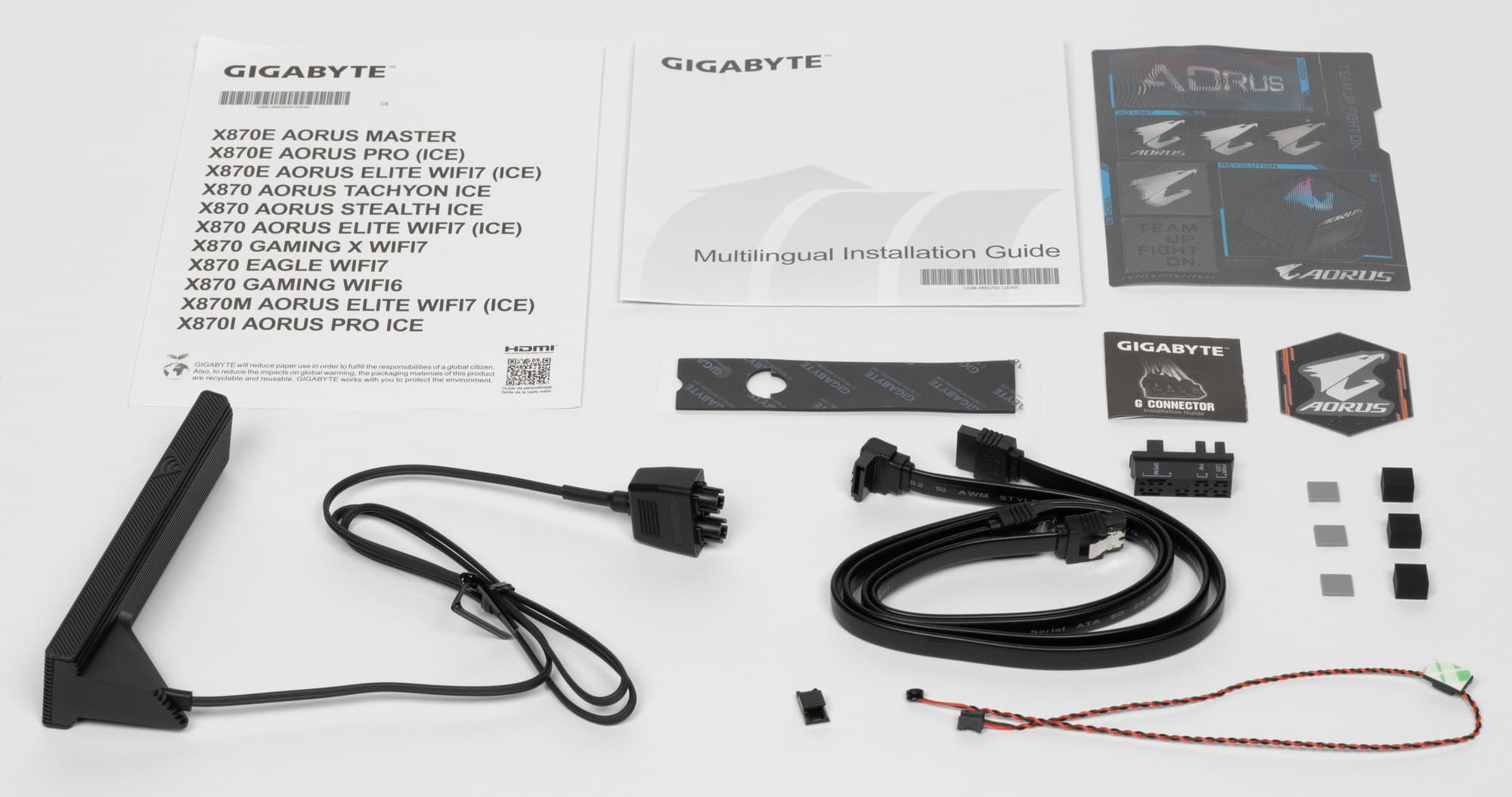 Gigabyte X870E Aorus Pro поставляется в традиционной коробке фирменного дизайна серии. Комплект размещен под платой в отдельном отсеке.