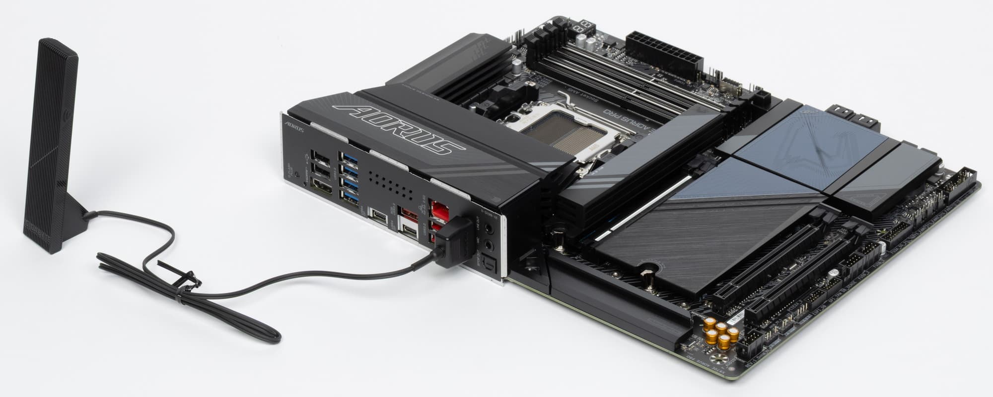 Имеется и комплексный беспроводной адаптер на контроллере Qualcomm QCNCM865, через который реализованы Wi-Fi 7 (802.11a/b/g/n/ac/ax/be) и Bluetooth 5.4. Он установлен в слот M.2 (E-key), и его разъемы для привинчивания выносных антенн выведены на заднюю панель.