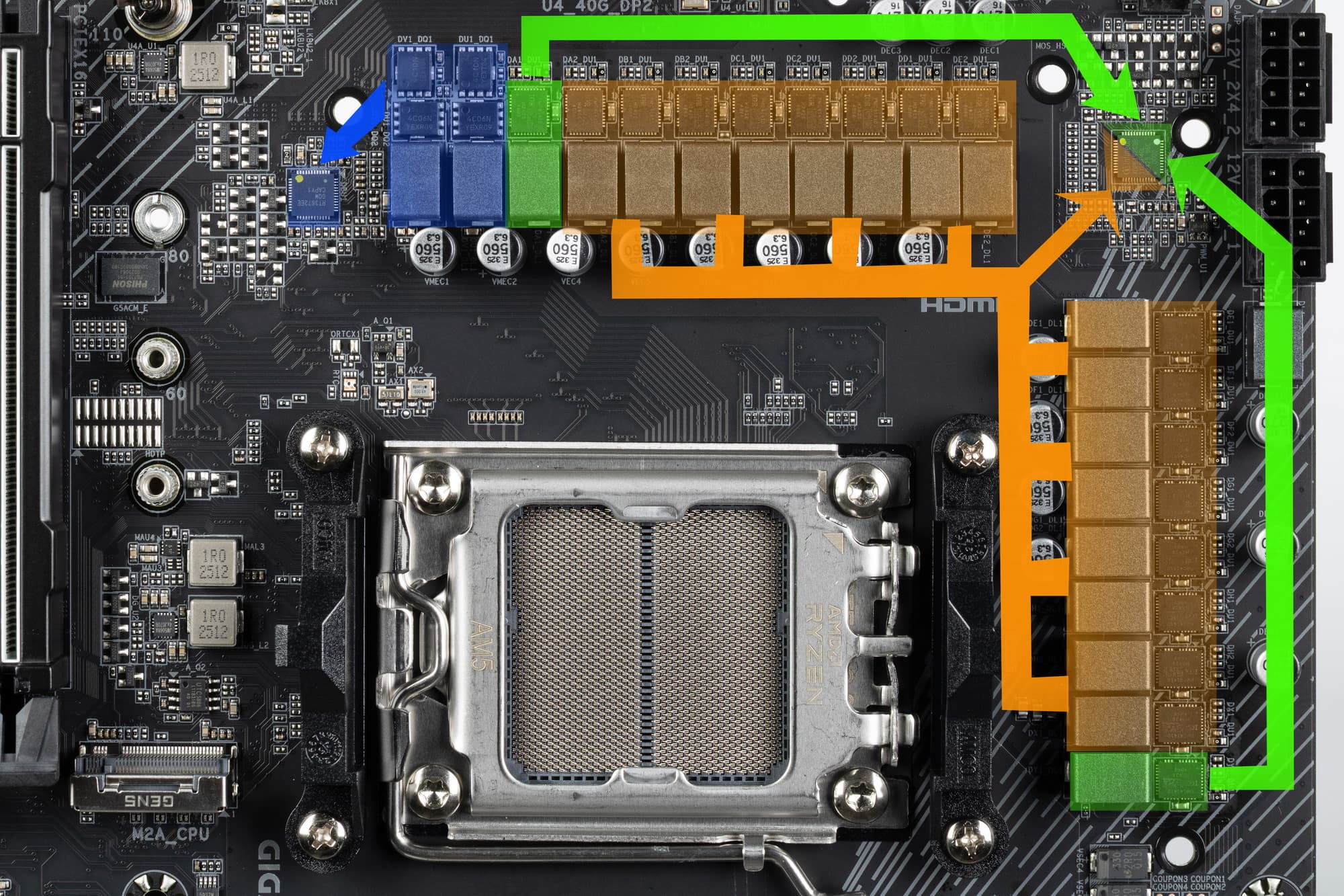 Внешне схема питания выглядит как 16+2+2: 16 фаз — ядро процессора, 2 фазы — SoC (I/O-чиплет Ryzen), 2 фазы — VDD_MISC (вывод встроенной графики).