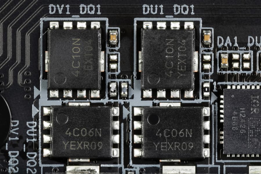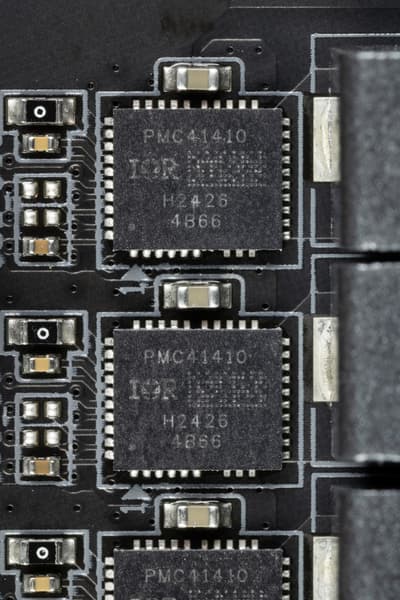 Каждый канал фазы VCore и встроенной графики имеет суперферритовый дроссель и транзисторную сборку PMC41410 от Infineon (ex- IOR) (до 105A).