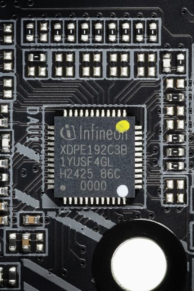Управляет обоими наборами фаз (16+2) ШИМ-контроллер XDPE192C3B от Infineon, рассчитанный на 12 фаз, поэтому у фаз питания для VCore организовано параллельное управление: 8x2 плюс 2 фазы на встроенную графику: физически 10 фаз питания.