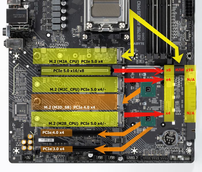 Вначале изучим распределение линий PCIe (чипсет X870E обладает 20 PCIe линиями (плюс 4 линии на аплинк с процессором).