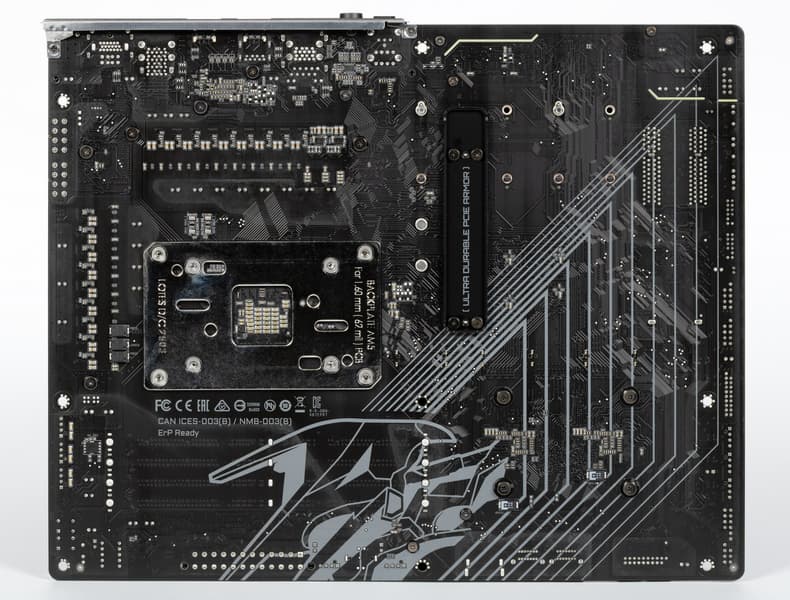 Кстати, вот одно из традиционных отличий продуктов топового уровня от остальных: оснащение слота для видеокарты PCIe x16 очень внушительной пластиной жесткости с оборотной стороны PCB.