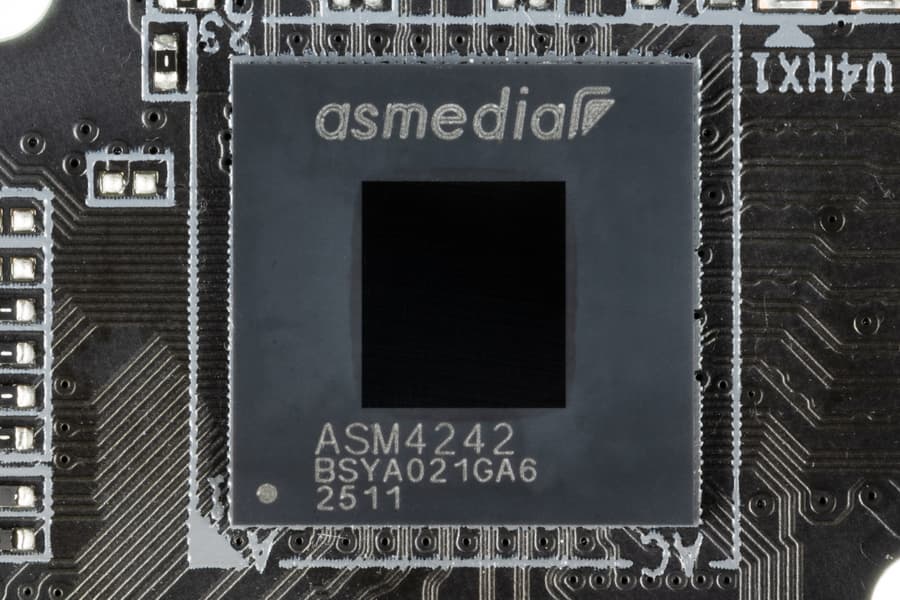 - 2 порта USB4: оба реализованы с помощью хаба ASMedia ASM4242 (на него потрачены 4 линии PCIe 4.0 от CPU) и представлены двумя портами Type-C на задней панели;