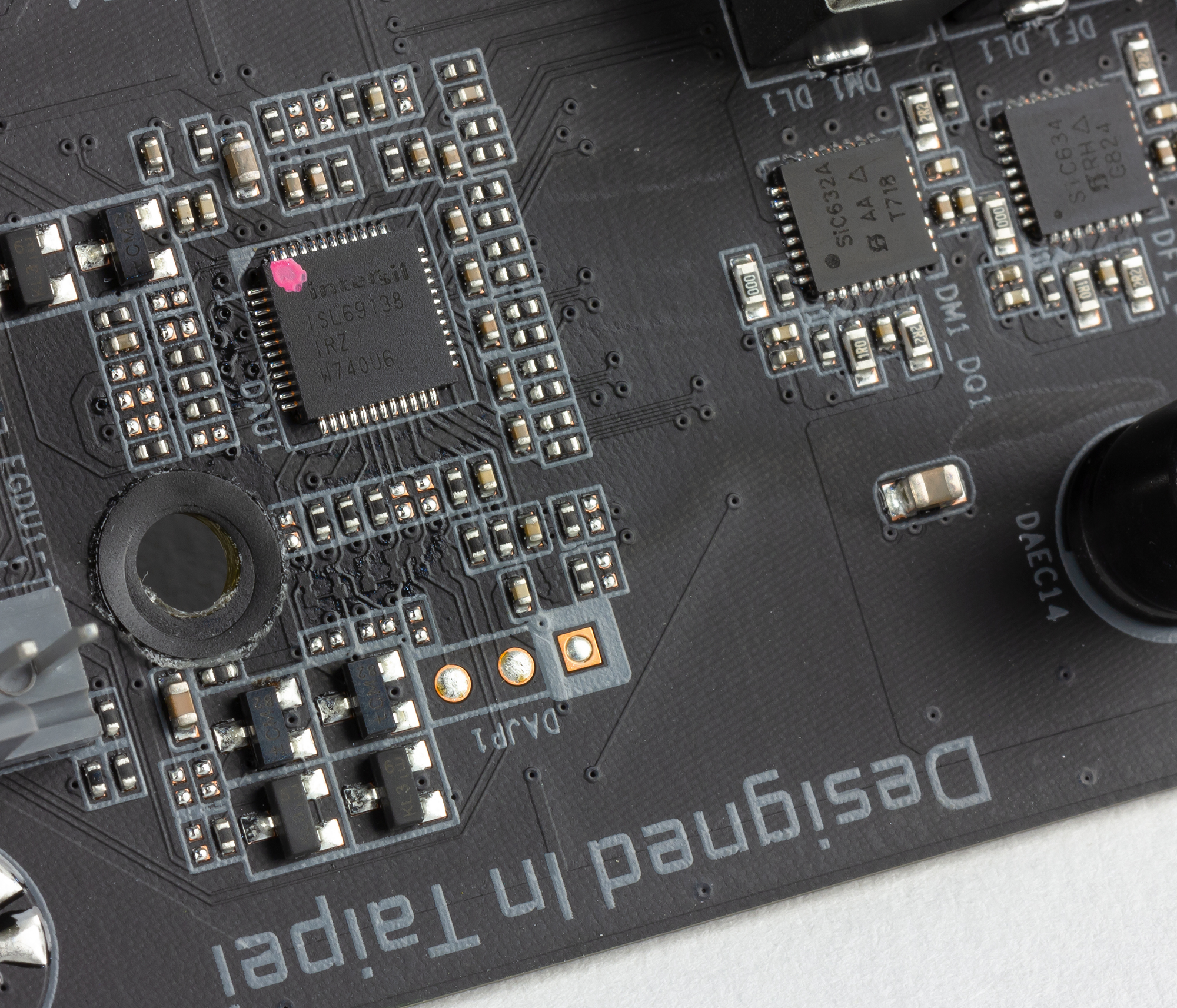На официальной странице платы заявлено применение системы питания процессора с использованием сборок DrMOS по схеме «12+1» на транзисторах Vishay Siliconix SiC634 (50А) с дублерами ISL6617A с обратной стороны платы.