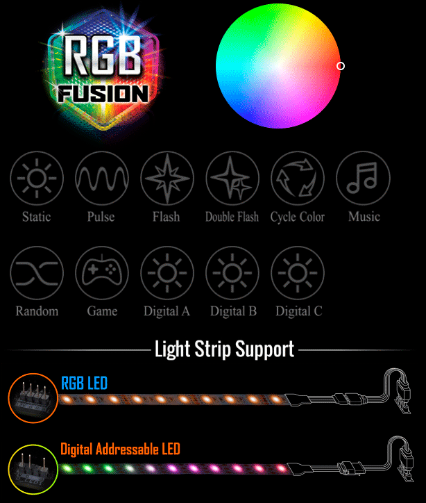 Кроме встроенной подсветки, к плате можно подключить две адресуемые и две не адресуемые светодиодные ленты, длина каждой из которых может достигать двух метров. Управление подсветкой и синхронизация подсветки RGB-лент осуществляется через фирменное приложение Gigabyte RGB Fusion.