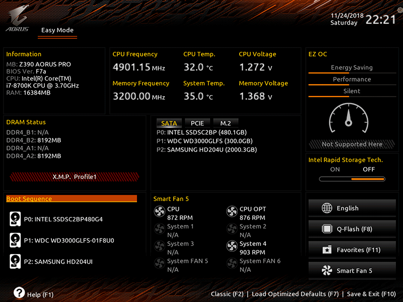 - системная плата: Gigabyte Z390 Aorus Pro (Intel Z390, LGA1151-v2, BIOS F7а от 7.11.2018);