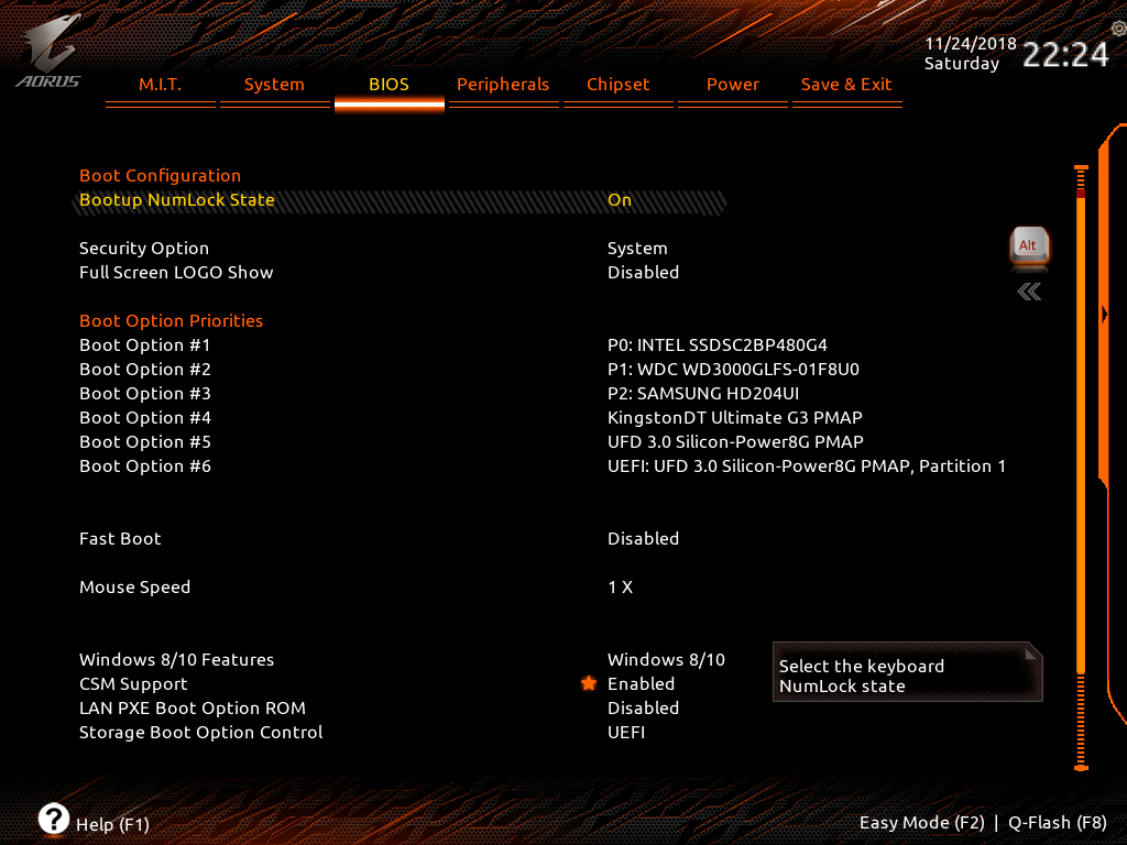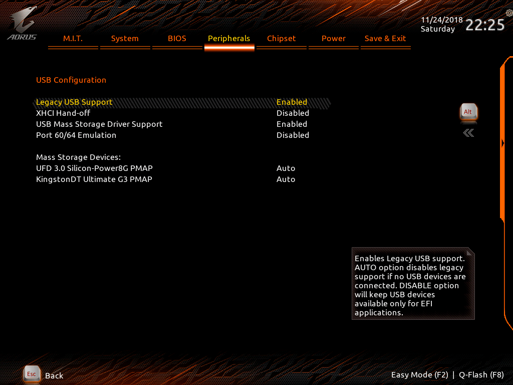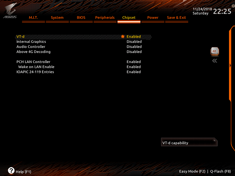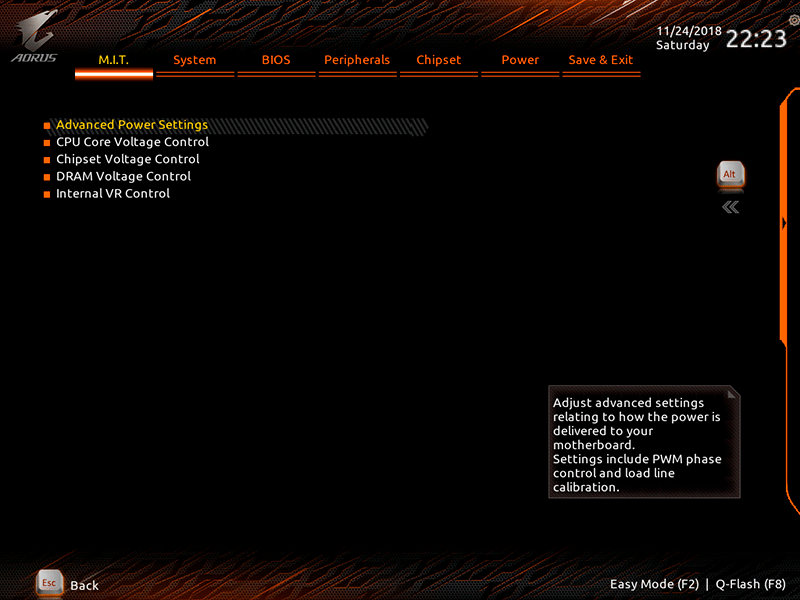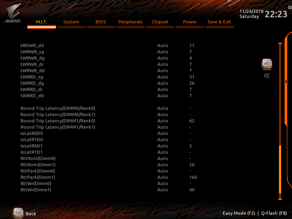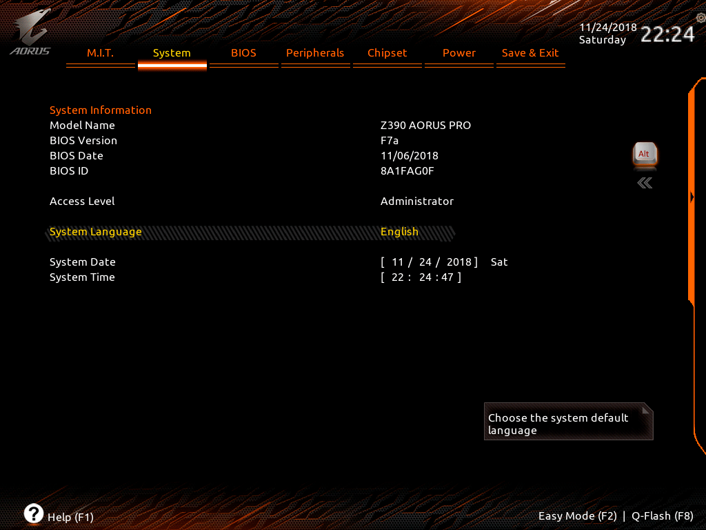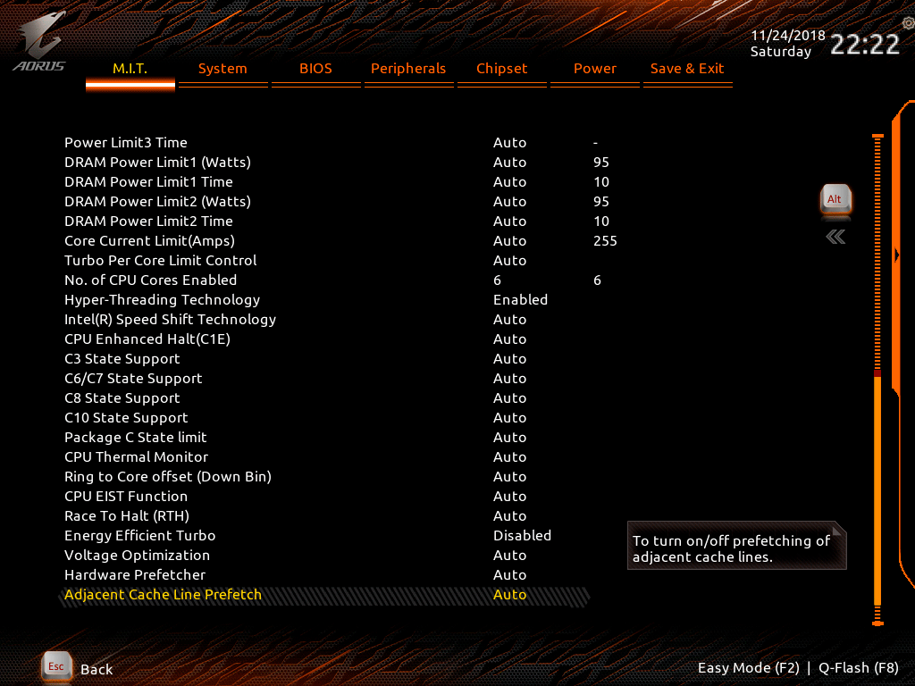 Во время тестирования нами Gigabyte Z390 Aorus Pro последний доступный BIOS F7a был в бета-статусе и датирован 7 ноября 2018 года. Он и был прошит в основную микросхему на плате. В этом разделе мы сразу же приведем скриншоты BIOS с настройками процессора и памяти, которых нам удалось достичь при разгоне в процессе тестирования и о которых мы расскажем уже в следующем разделе.