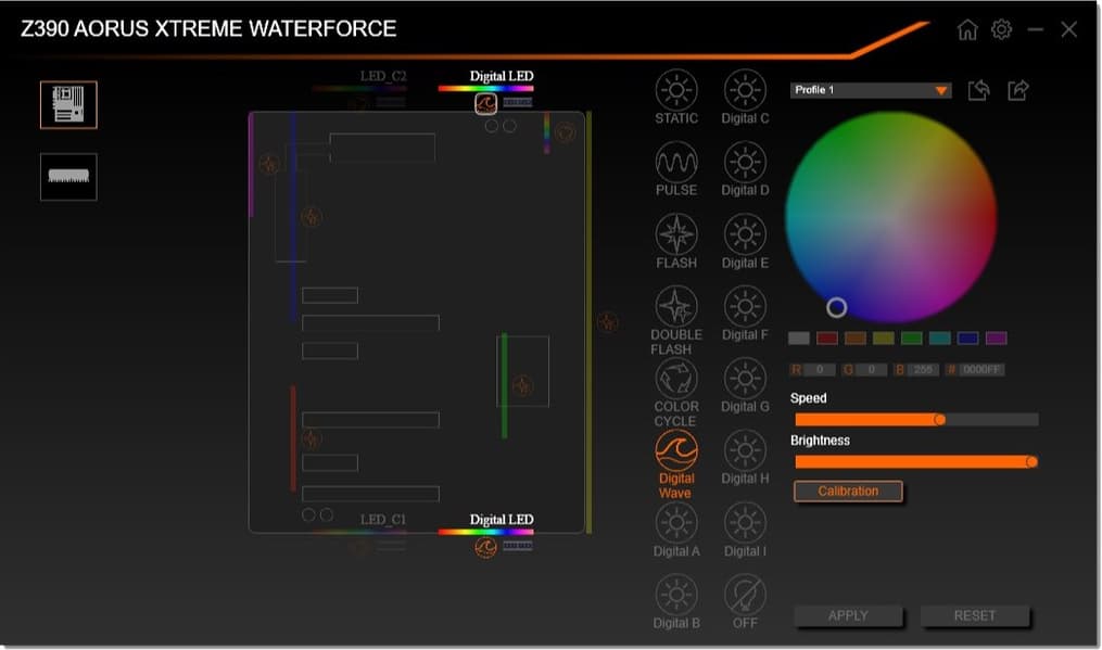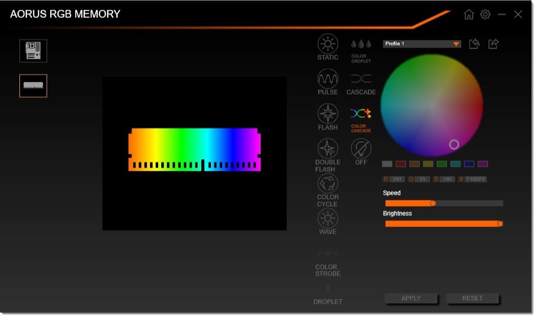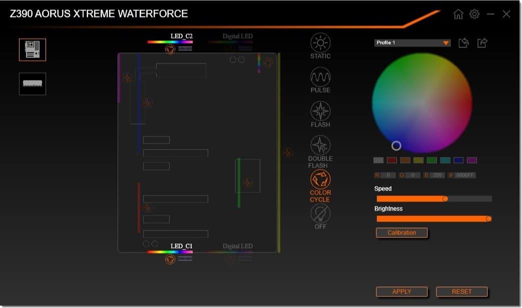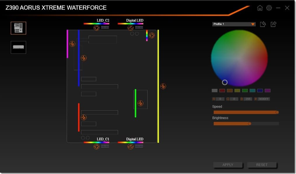 Утилита умеет распознавать все фирменные элементы Gigabyte, оснащенные подсветкой, включая модули памяти. Поэтому в нашем случае (а мы использовали RGB RAM Gigabyte) слева появилось два «обслуживаемых» элемента: материнская плата и модули памяти.