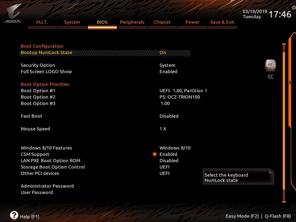 Странно как-то назвали вкладку, по сути это опции загрузки, Boot. Разработчики не зря поставили «*» у поддержки CSM, это связано с новыми режимами работы загрузочных накопителей в UEFI, а также с файловыми системами. Старые таблицы разделов базируются на MBR, этот вариант распознают все операционные системы. Новые базируются уже на GPT, который «понимает» в качестве загрузочного только Windows 8/10. Если CSM выключить, это будет означать, что загрузочный накопитель отформатирован с GPT, загрузка с него пойдет быстрее (по сути, UEFI «передает вахту» Windows 10, даже не меняя заставку). Если же у вас загрузочный накопитель с MBR, то CSM следует включить, тогда будет опрос и запуск загрузки как раньше. Стоит отметить, что все NVMe-накопители поддерживают загрузку только с GPT.