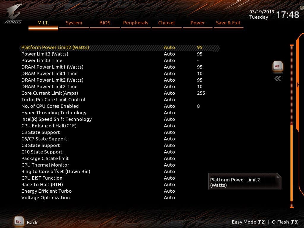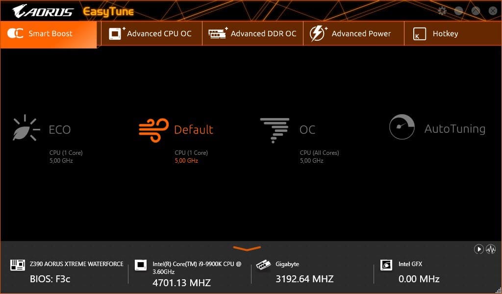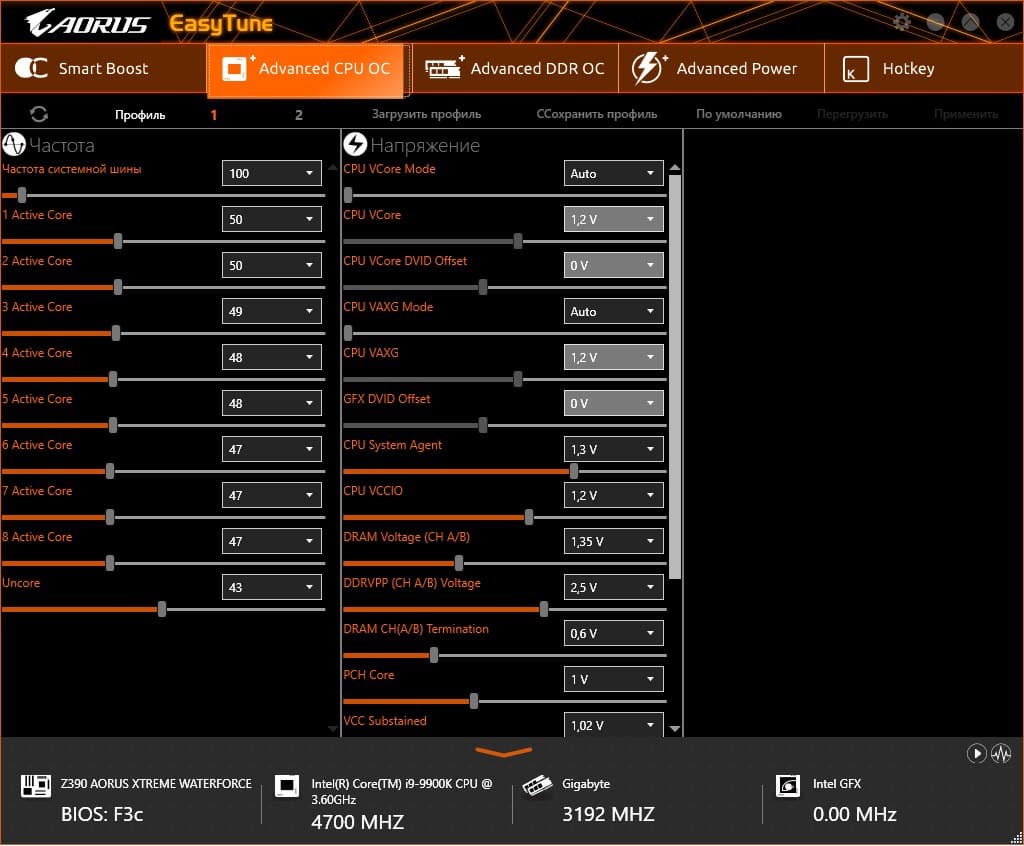 Стартовая вкладка EasyTune — это для тех, кому неохота влезать в тонкости разгона. Здесь можно просто выбрать режим, чтобы система сама выставила все частоты и напряжения. В процессорах Intel давно работает технология Turbo Boost, которая позволяет автоматически поднимать частоту работы ядер до заданного максимума в пределах теплопакета и температуры конкретной модели процессора. Практически все экземпляры Core i9-9900K при нормальном охлаждении в режиме по умолчанию «поднимаются» со штатной частоты 3,6 ГГц до 5 ГГц.