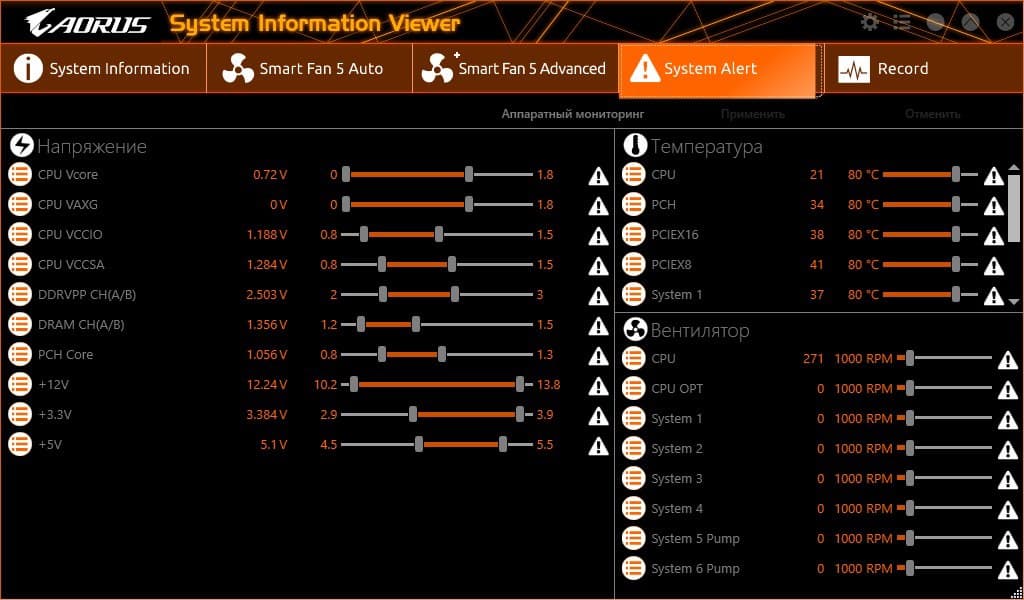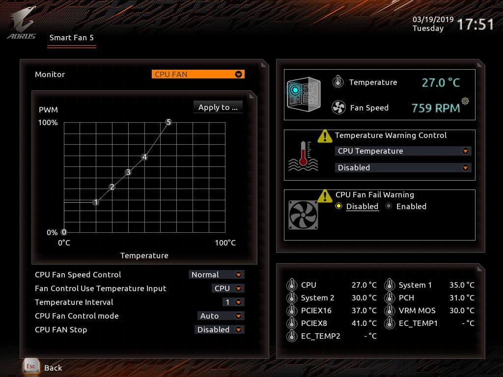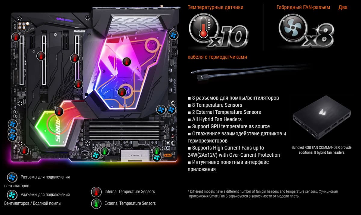Только представьте себе, какая катастрофа может случиться, если все разъемы и сенсоры этой платы задействовать на полную мощность. Возможности Gigabyte Z390 Aorus Xtreme WaterForce в плане охлаждения и мониторинга просто невероятные! Управление всем этим богатством возложено на утилиту SmartFan 5.0, а также реализовано управление в настройках UEFI/BIOS.