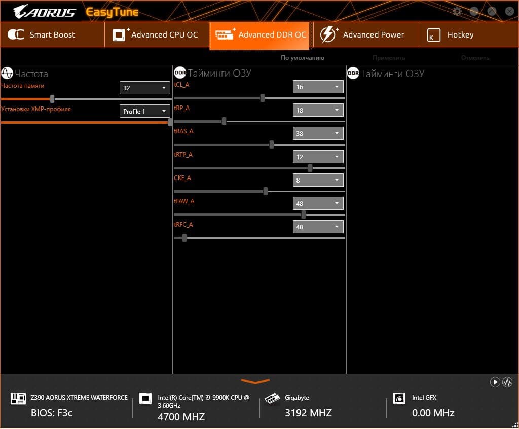 Память при активном профиле XMP имеет установки этого профиля, но при желании можно вручную «подкрутить» тайминги и прочие параметры, тогда справа появится информация о том, что было и что будет.