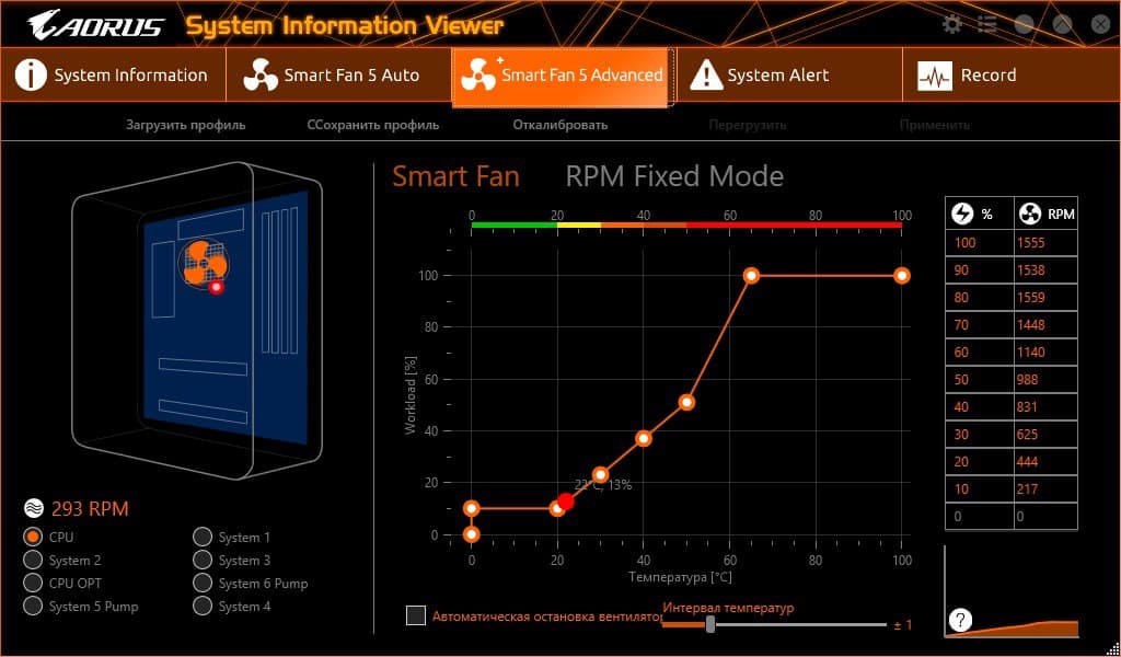 Понятно, что на этой вкладке мы выбираем режимы, исходя из шумовых характеристик. Режимы «умные», то есть если вы выбрали, например, «тихий» режим, то частота вращения вентиляторов будет поддерживаться на минимальном уровне до тех пор, пока это возможно из-за нагрева процессора/платы (мы помним, что плата оснащена массой термодатчиков), затем сформируется сигнал для снижения частот в рамках Turbo Boost.
