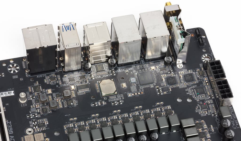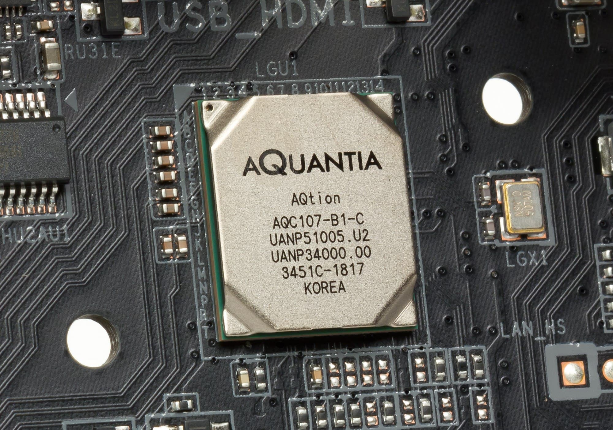 Также плата укомплектована современным сетевым контроллером Aquantia AQtion AQC107 с максимальной скоростью передачи данных 10 Гбит/с (его разъем RJ-45 — красного цвета). Правда, пока это не особенно актуально, даже проверить работу контроллера просто негде и нечем: все имеющиеся бытовые сетевые устройства (роутеры и контроллеры) рассчитаны максимум на 1 Гбит/с.