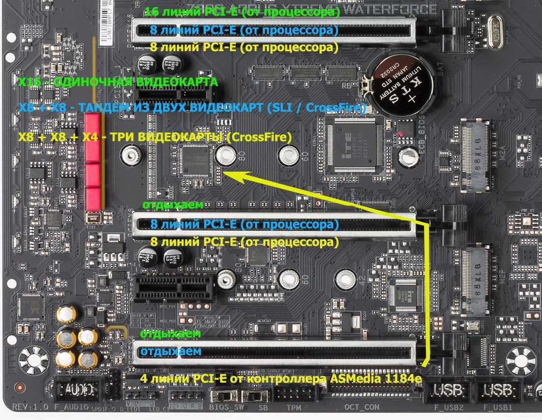 Распределением линий PCI-E между слотами в случае использования более одной видеокарты занимаются мультиплексоры ASM1480 той же ASMedia.