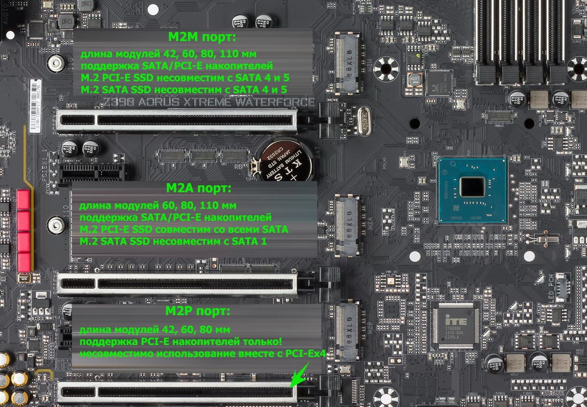 На коллаже выше объяснено, что верхние два слота M.2 поддерживают все виды накопителей (SATA и PCI-E), а нижний — только PCI-E.
