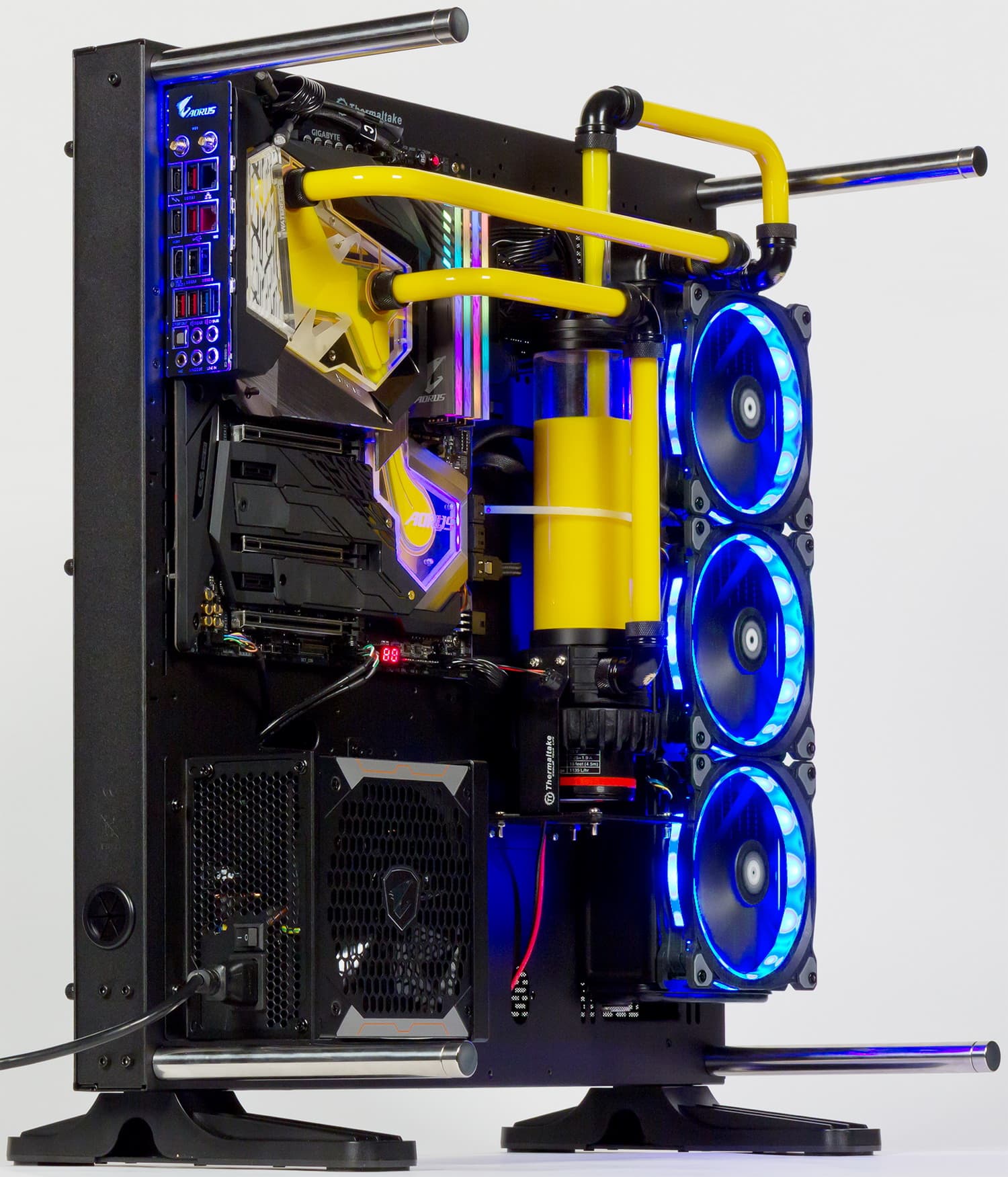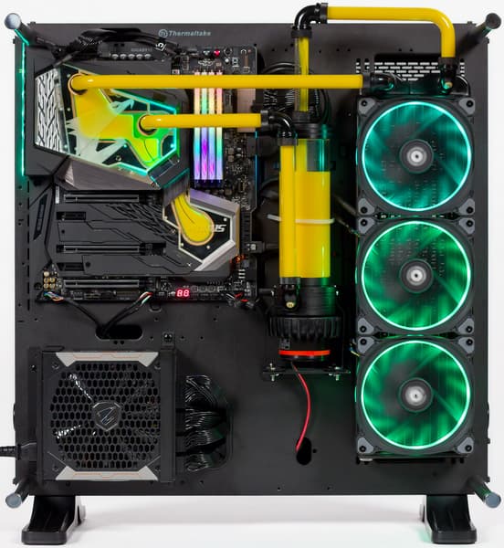 Ведь плата (сложно даже назвать этот набор «собери самогонный... ой, водогонный аппарат» платой) имеет водоблок, так что у владельца должна быть ЖСО (жидкостная система охлаждения), которую нам любезно предоставила компания Thermaltake. На получение, установку и т. п. тоже ушло какое-то время. Для сборки системного блока с платой и «водянкой» мы использовали корпус Thermaltake Core P7, который предназначен как раз для энтузиастов и предлагает красиво разложить все комплектующие, как на выставочном стенде.