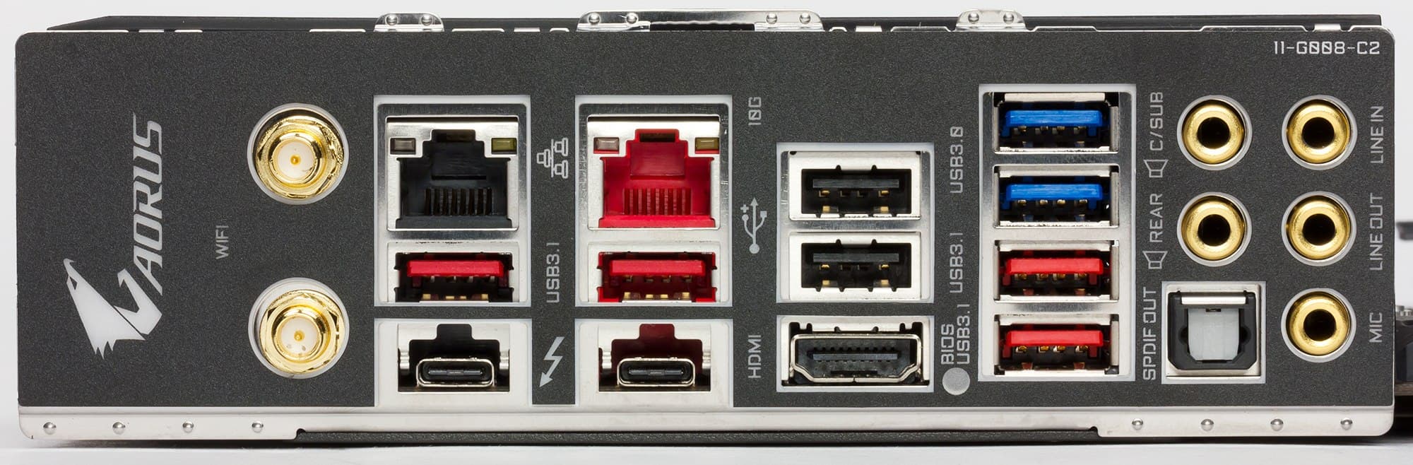 - 7 портов USB 3.1 (самые быстрые на сегодня): 5 портов реализованы через Z390 и представлены 4 портами Type-A (красного цвета) на задней панели и 1 внутренним портом Type-C (для подключения такого же разъема на передней панели корпуса); еще 2 порта Type-C реализованы через контроллер Intel Thunderbolt 3 и выведены на заднюю панель;