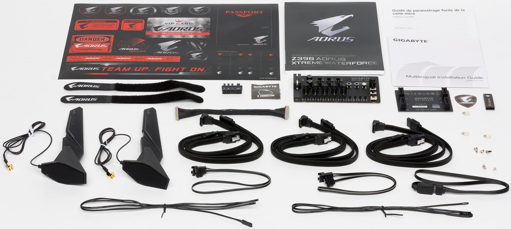 Понятно, что комплект поставки содержит ряд специфических элементов, связанных с направленностью и позиционированием Gigabyte Z390 Aorus Xtreme WaterForce. Например, есть специальная плата для облегчения разгона (мы поговорим о ней позже).