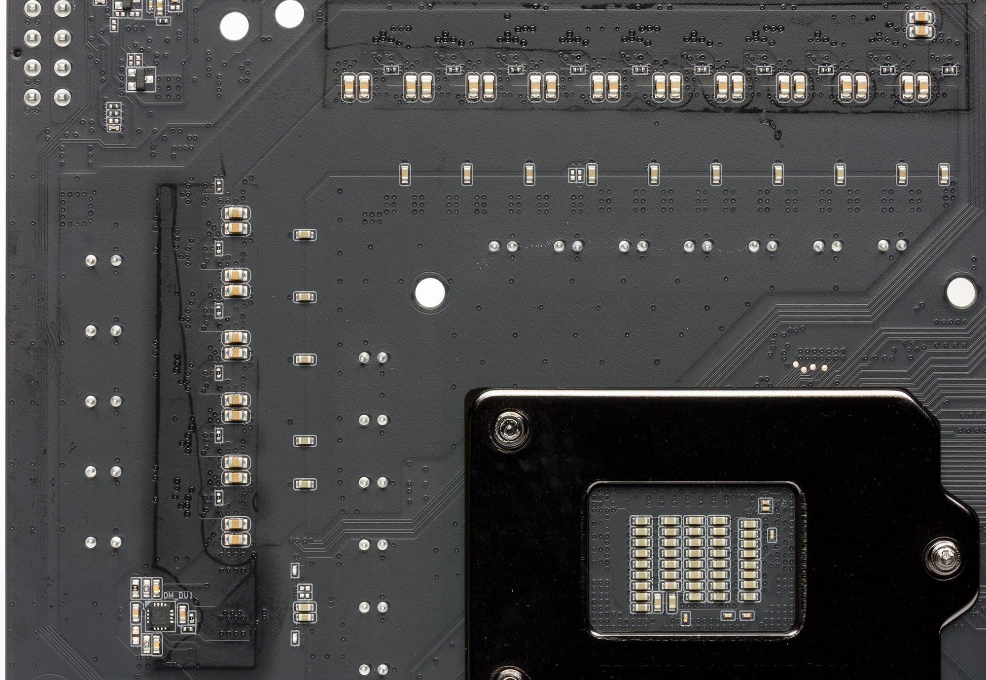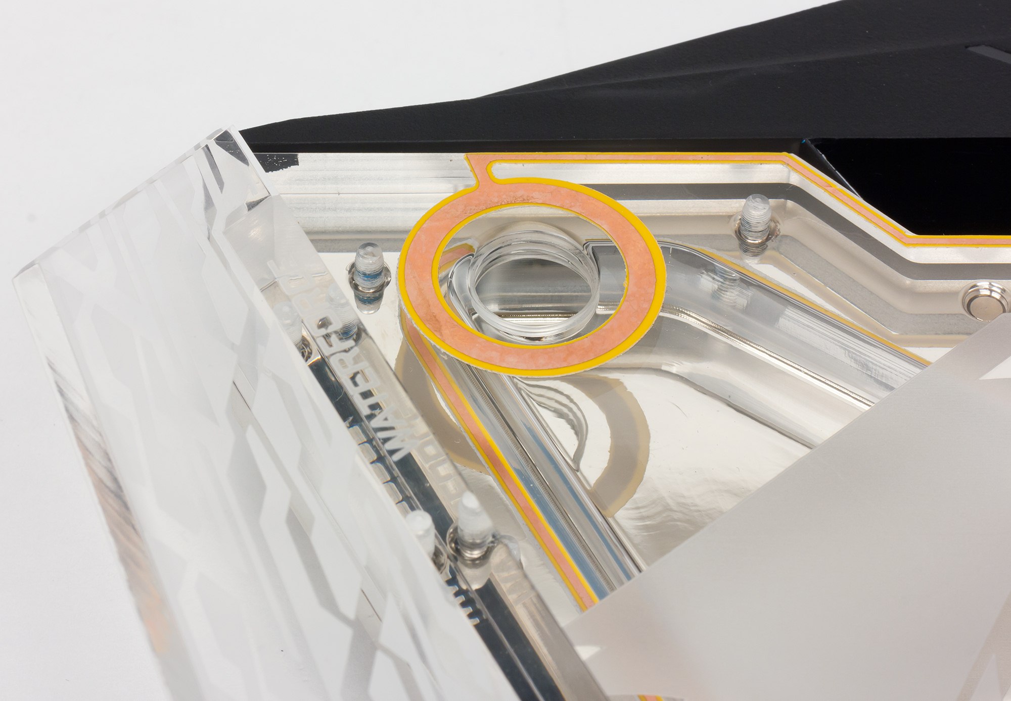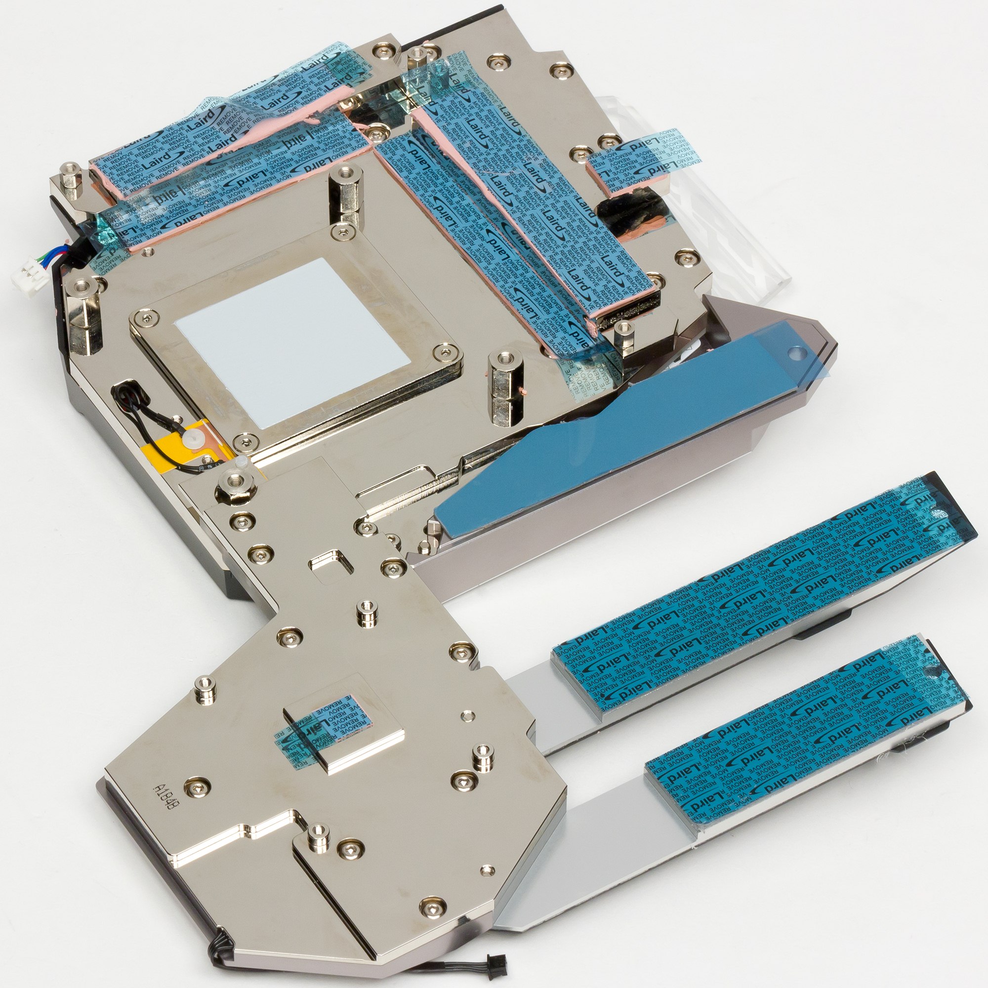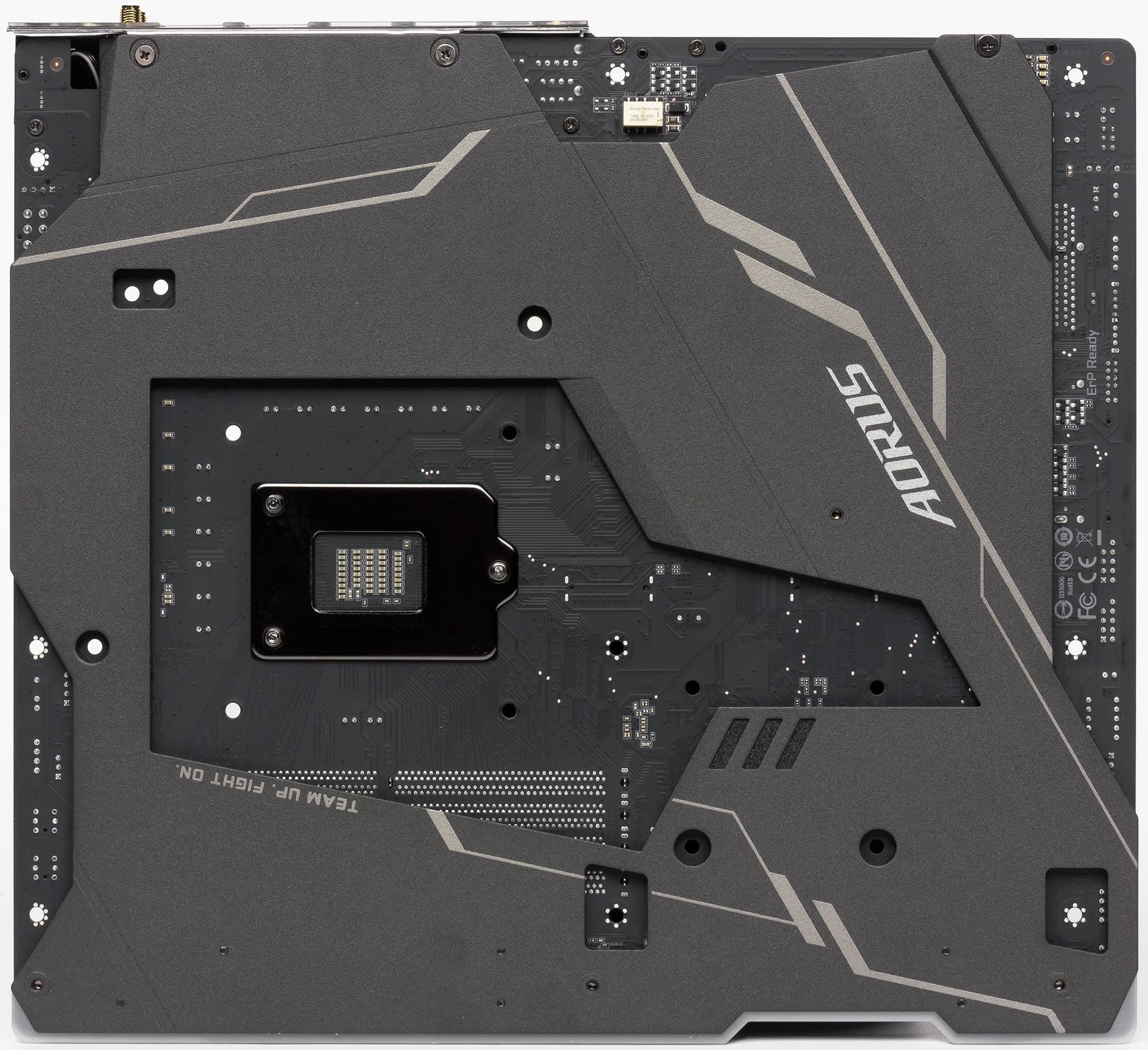 C оборотной стороны имеется пластина из алюминия с нанокарбоновым покрытием для предотвращения замыкания электроконтактов на PCB. Также пластина помогает отводить тепло от задней стороны PCB через термоинтерфейс и обеспечивает жесткость материнской платы, что очень важно при наличии водоблока.