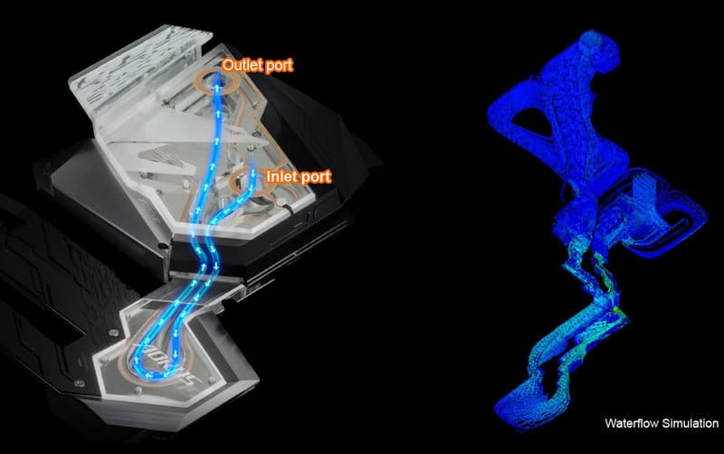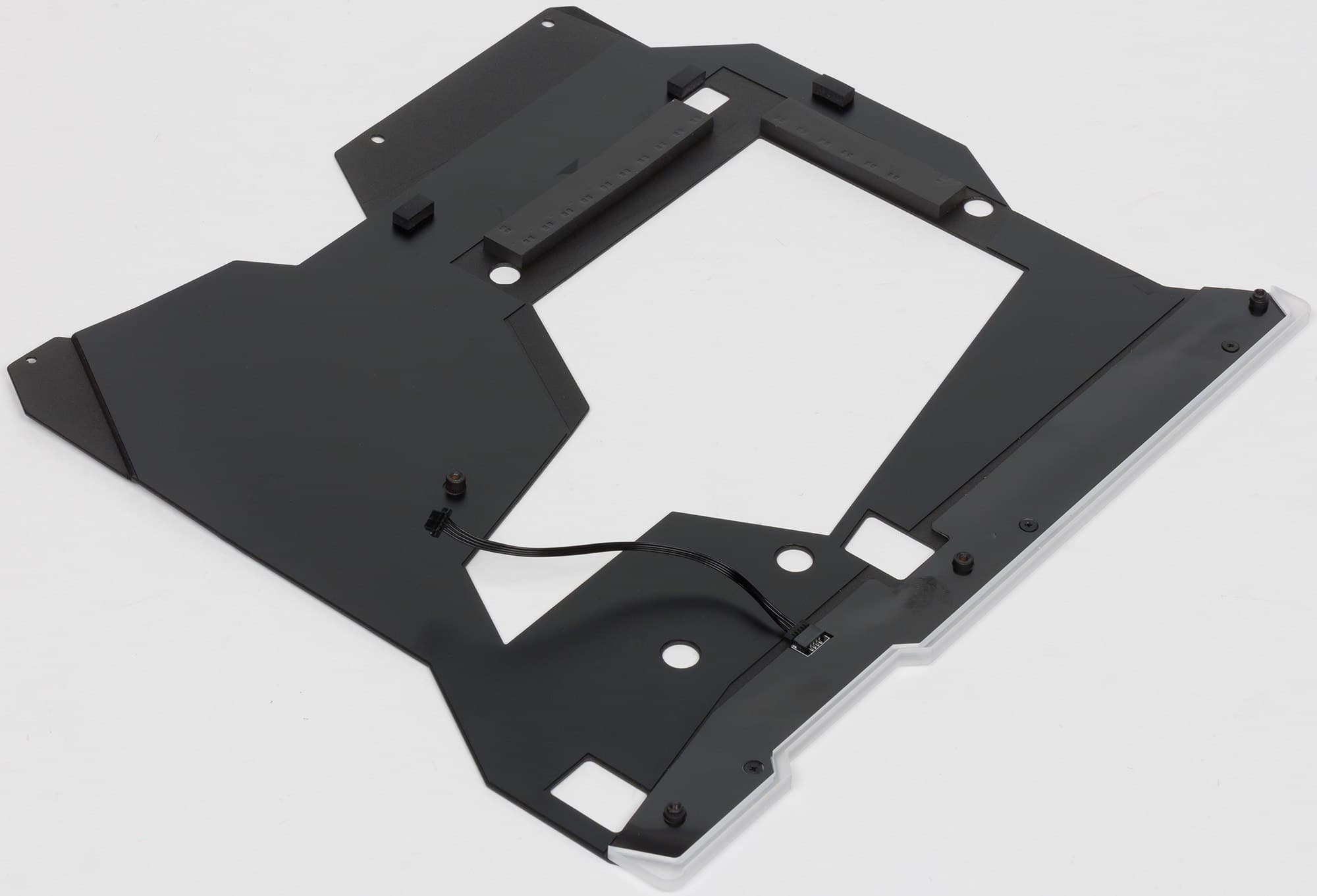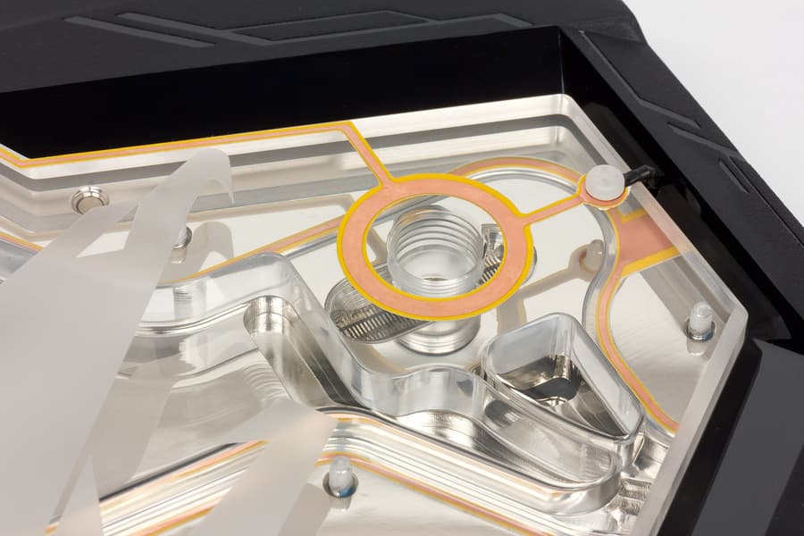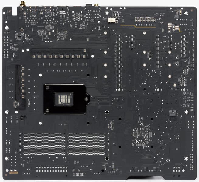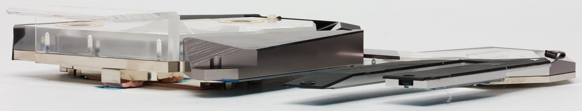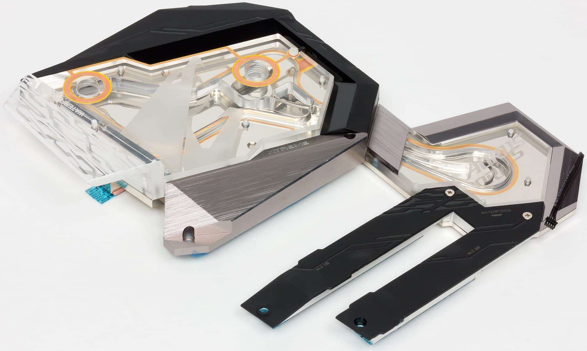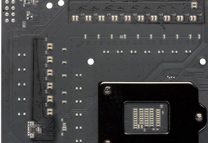 C оборотной стороны имеется пластина из алюминия с нанокарбоновым покрытием для предотвращения замыкания электроконтактов на PCB. Также пластина помогает отводить тепло от задней стороны PCB через термоинтерфейс и обеспечивает жесткость материнской платы, что очень важно при наличии водоблока.